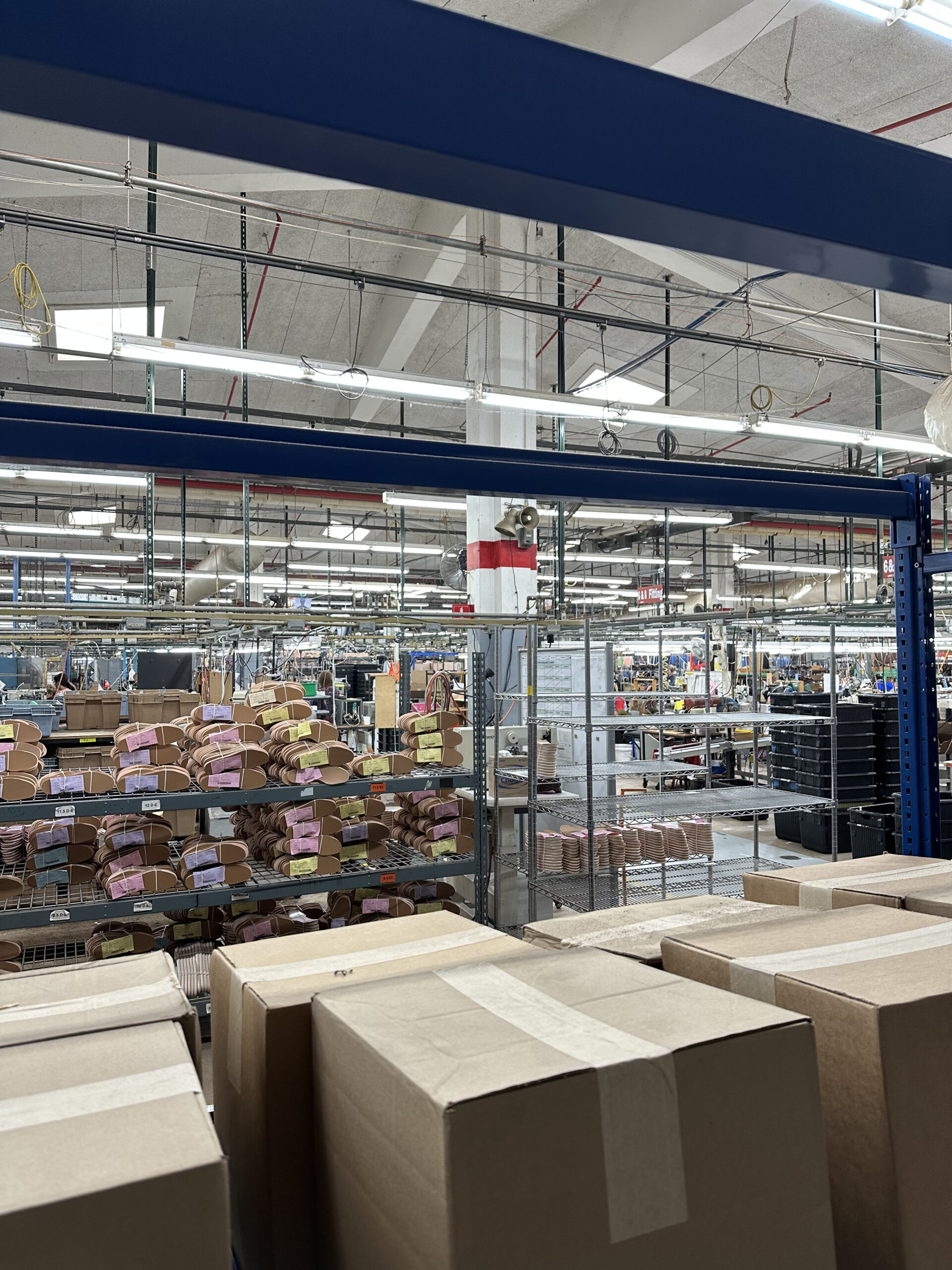 如果不走遍 S.B. Foot 两座独立厂房中的所有不同房间,就很难感受到它的规模。相比之下,当你走进伯恩赛德工厂时,你会立刻发现整个工厂的规模大得惊人。厂房的大部分区域都是一个巨大的房间,房间里分布着许多不同的工位和设备。生产车间主要由 “单元 “团队组成,这些团队专注于制鞋过程中的特定工序,例如裁片处理或将鞋面以“Z”字形缝合。在这些 “单元 “内,工人们轮流完成不同的任务,以防止单调和疲劳。如果没有迈克的指导,我们估计会在车间里迷路。