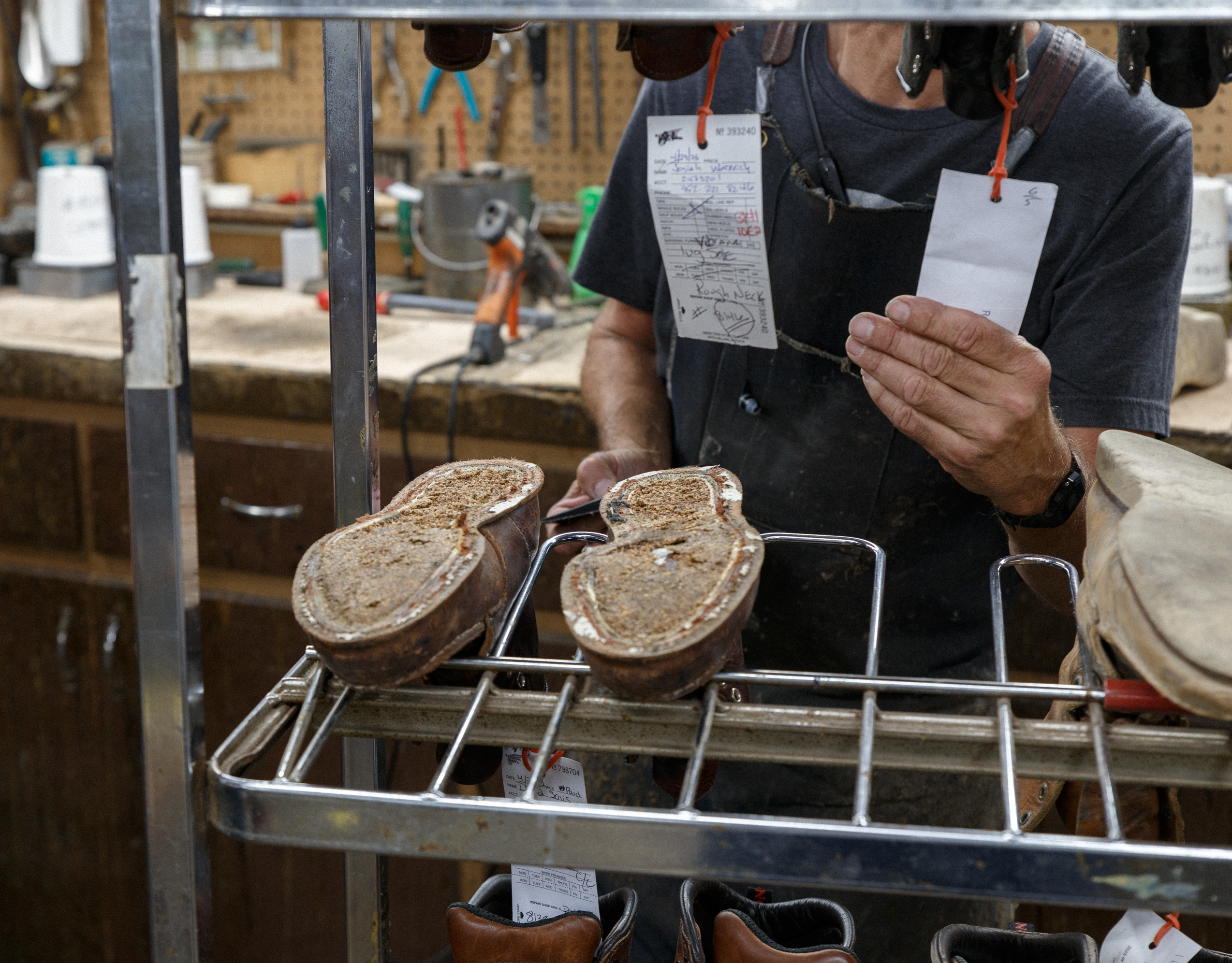 修理部有十几名鞋匠。其中一些是来自红翼鞋厂以外的经验丰富的鞋匠,而另一些则来自鞋厂的不同部门。迈克告诉我,尽管等待修理的靴子堆积如山,令人望而生畏,但每双靴子的等待时间仍然只有四周左右。