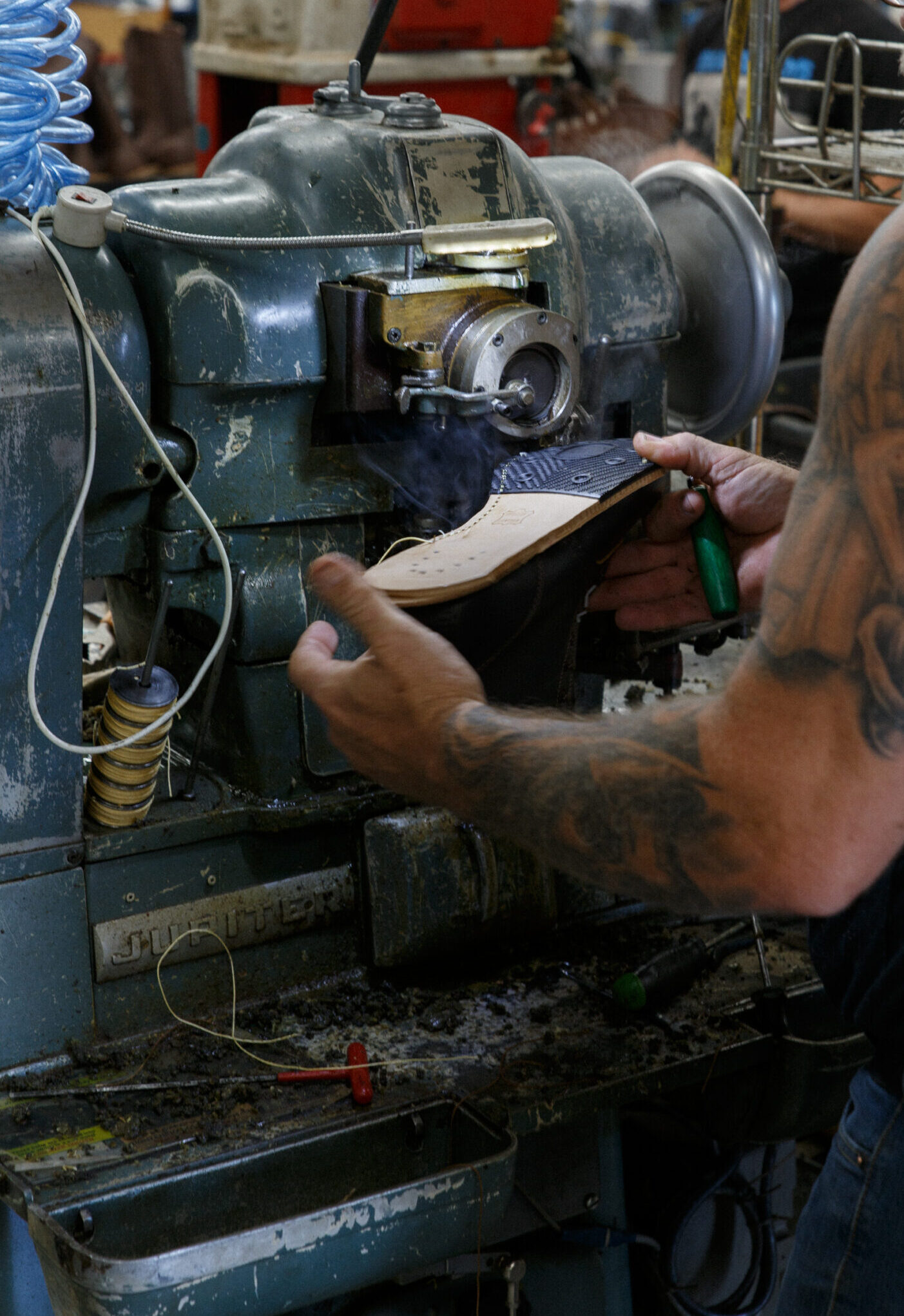 在用一个类似油炸锅的装置快速蒸过鞋面后,会把鞋楦装入鞋面。每双靴子的鞋面都会被压紧在鞋楦上,以确保鞋面与鞋楦紧密贴合,然后再进行实际绷楦。绷楦机使用机械爪将鞋面拉到鞋楦周围,并根据每双靴子的特定鞋楦、尺码和皮革进行校准,以确保适当的力道。