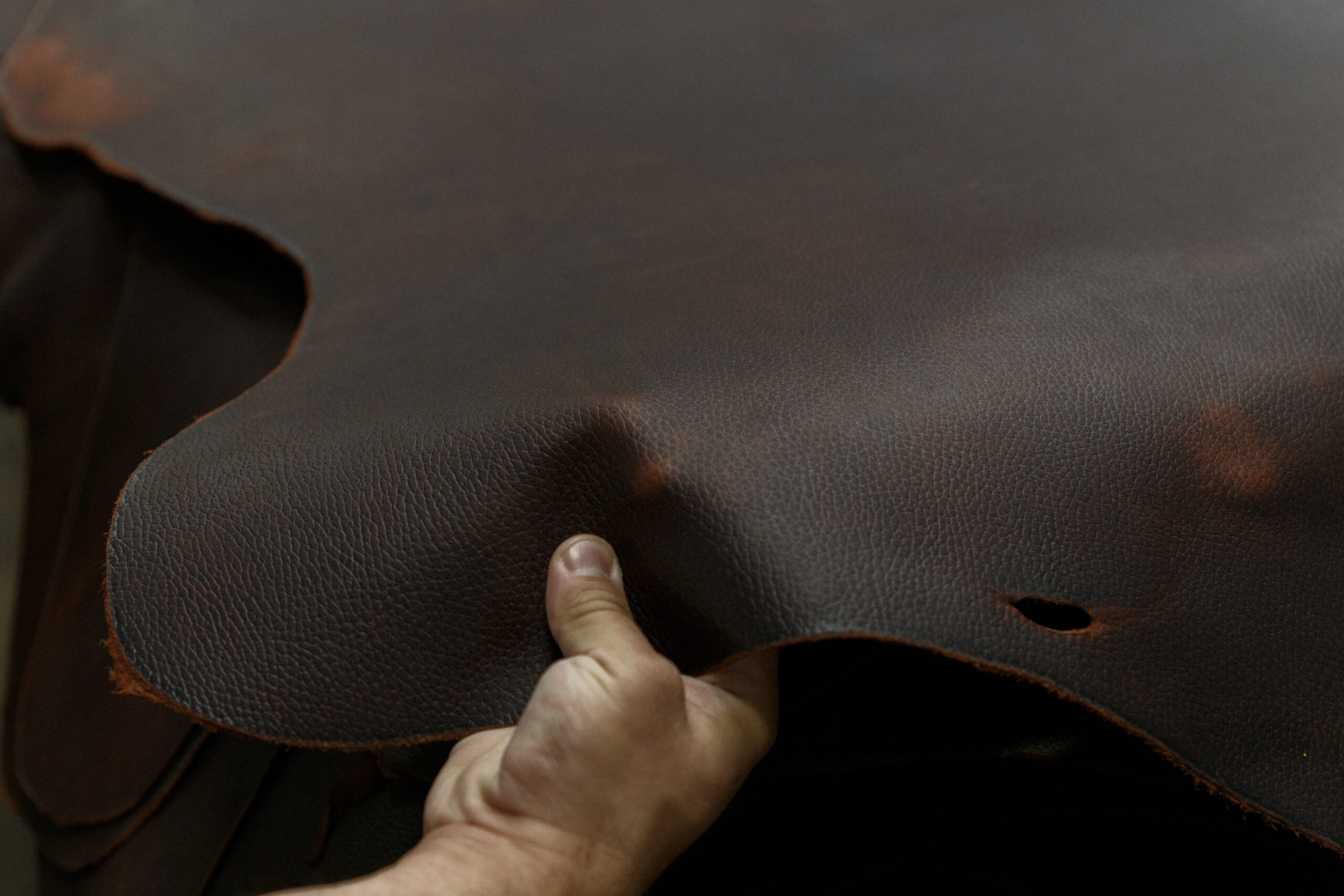 首先,每张皮革都必须进行厚度和质量分级。分拣员用测厚仪检查每一块皮革,以确定皮革的平均厚度。其中一位分拣员杰夫向我们解释说,他们会查看整张皮革是否有伤疤、切口和其他瑕疵,然后对皮革进行分级(从 A 级到 E 级),将皮革扔到相应的堆中。A 级皮革代表瑕疵极少、粒面清晰、苯胺/未着色状态下外观极佳的皮革,通常用于红翼Heritage系列。