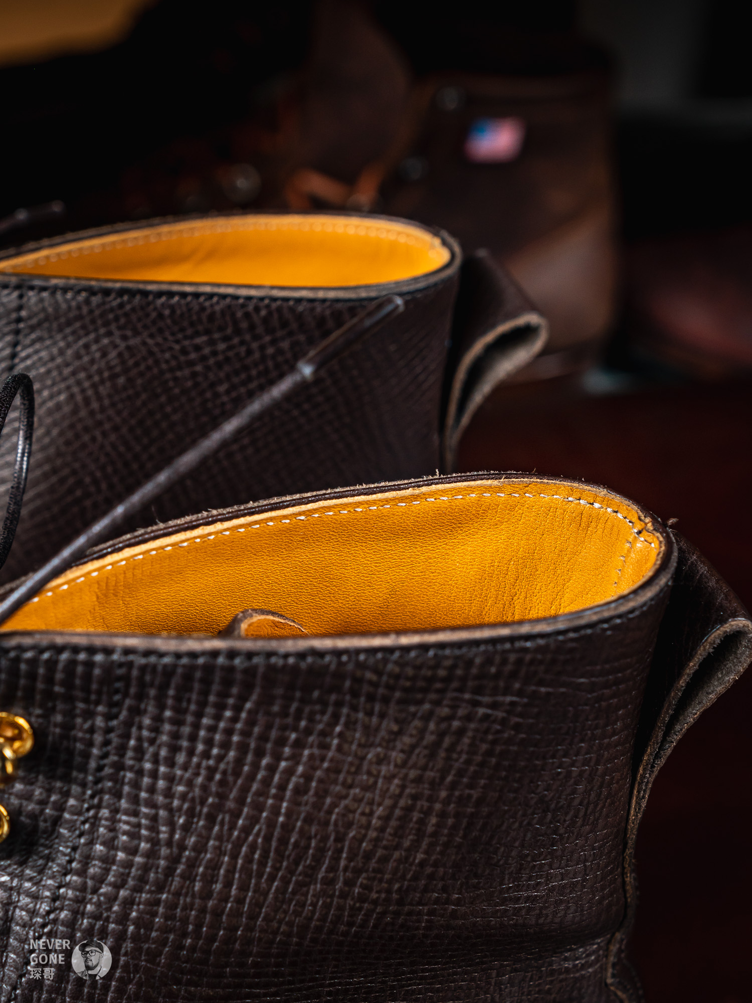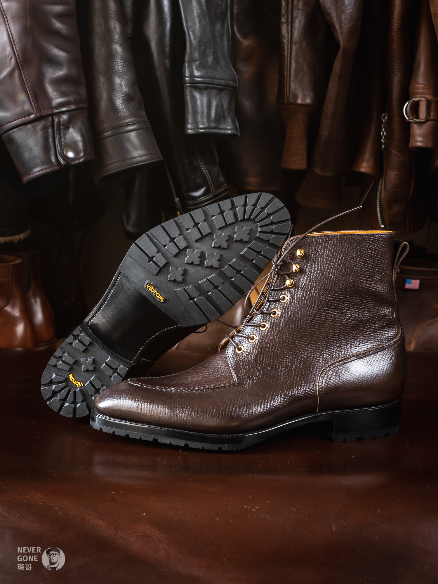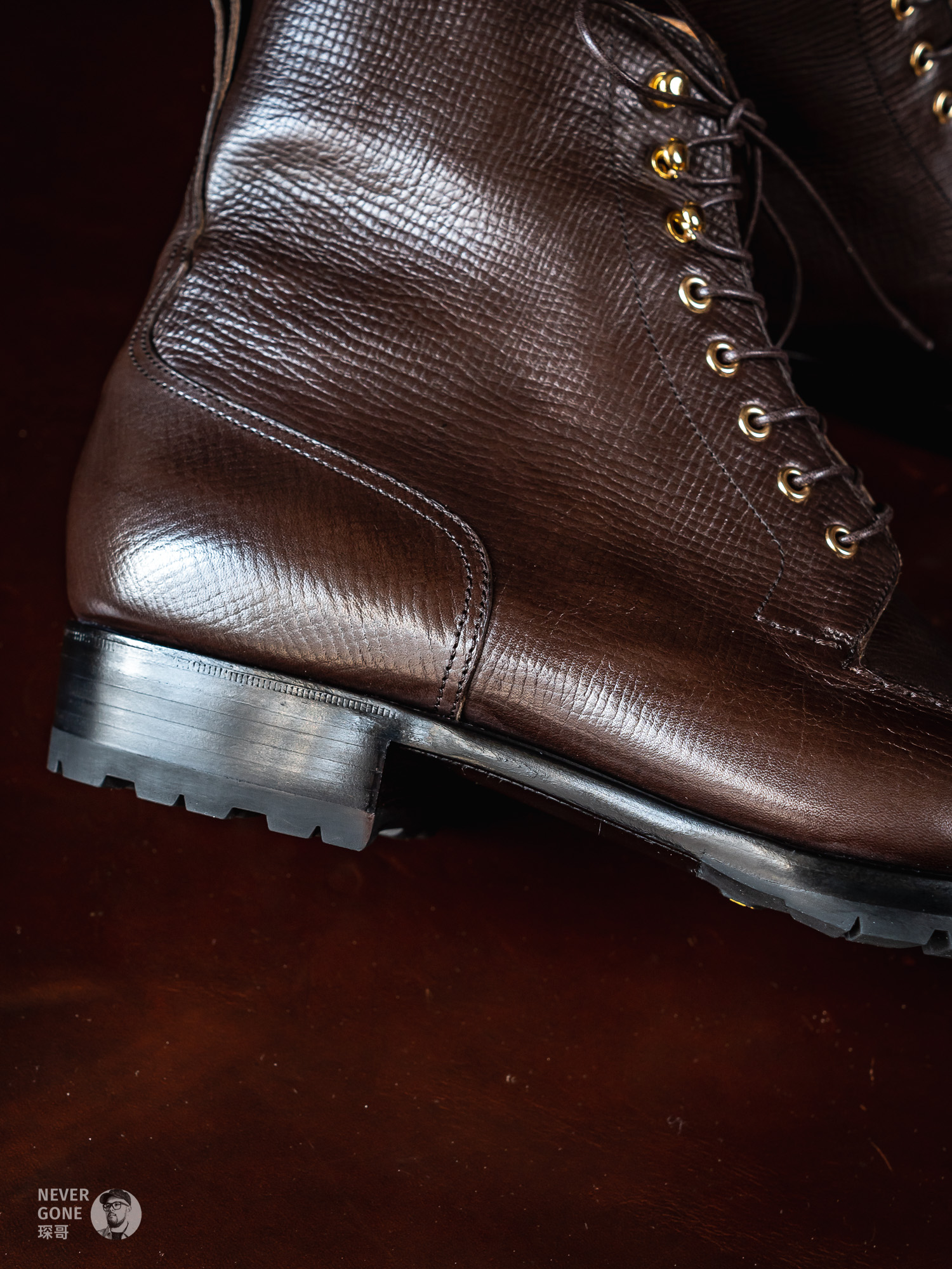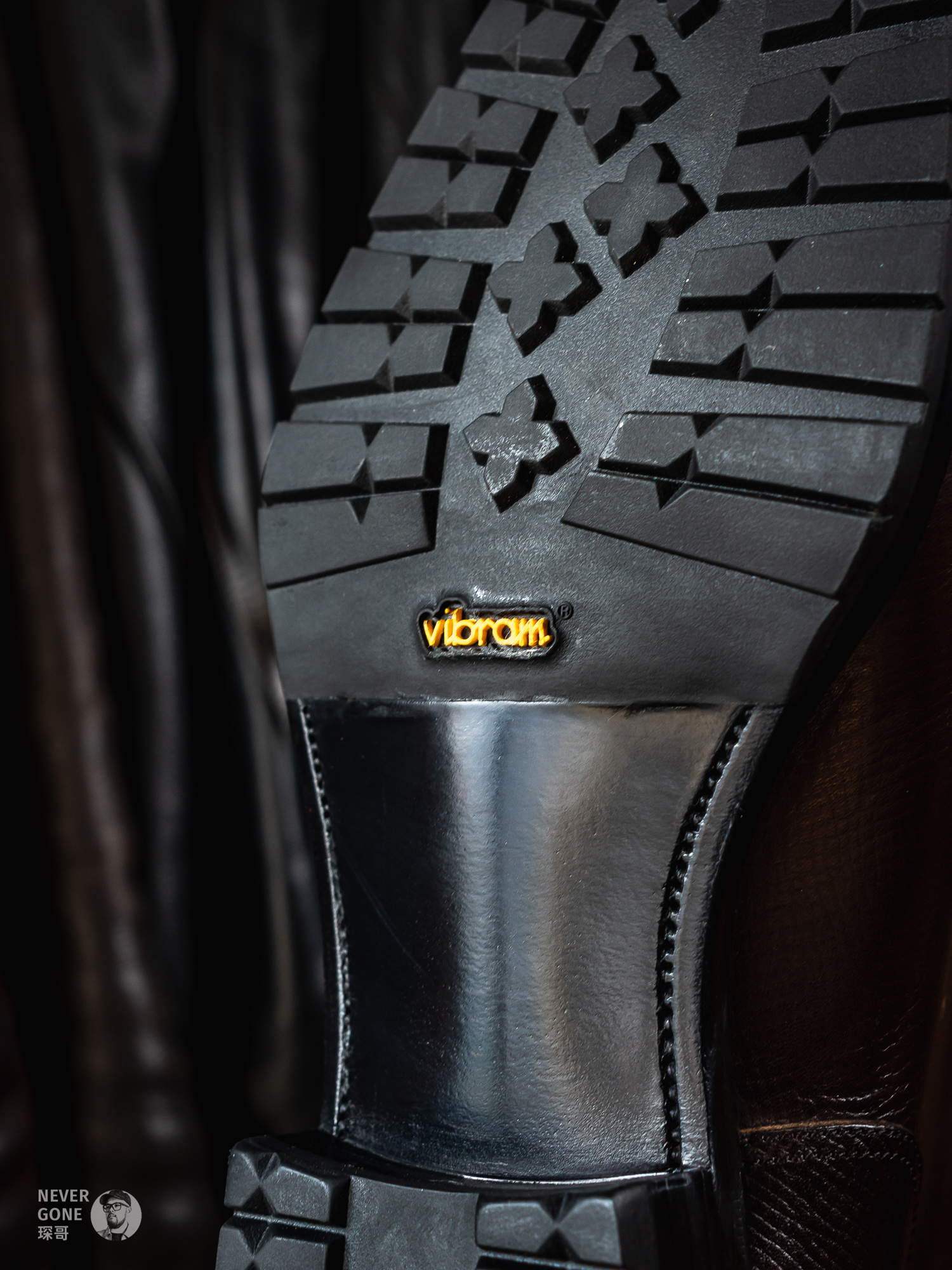 作为喜欢半工装半正装中间地带的靴子佬,我偏好粗犷与精致融合的东西。Utah这种纹路皮本身是属于比较村的,而且这个分裂头款式也比较村,所以我觉得琴底盲腰之类的不太搭这个风格。于是,我选择了普通的手缝沿条+Vibram金标狗牙底,并且加上了金色鞋眼,这样看起来我个人觉得更和谐一点