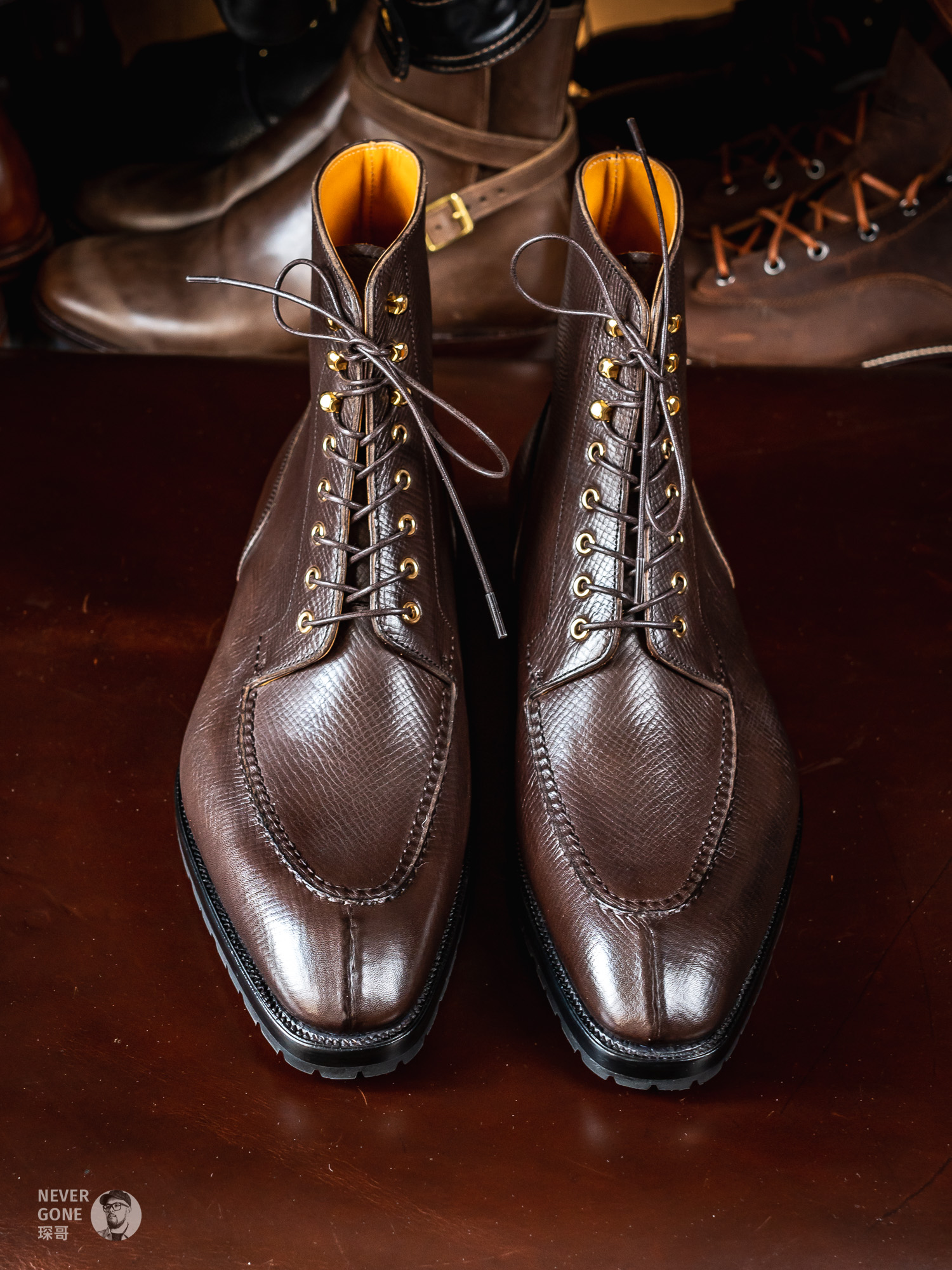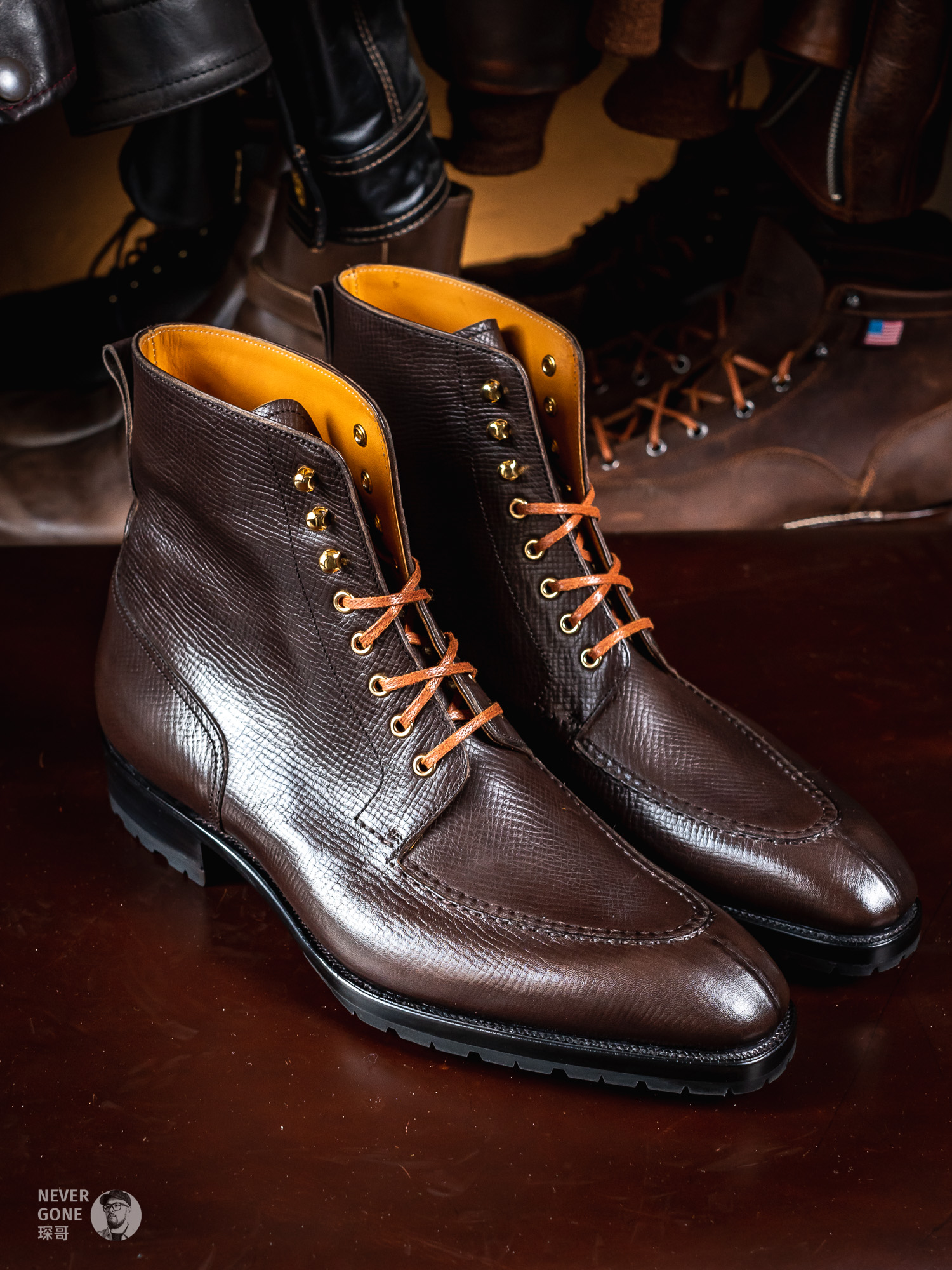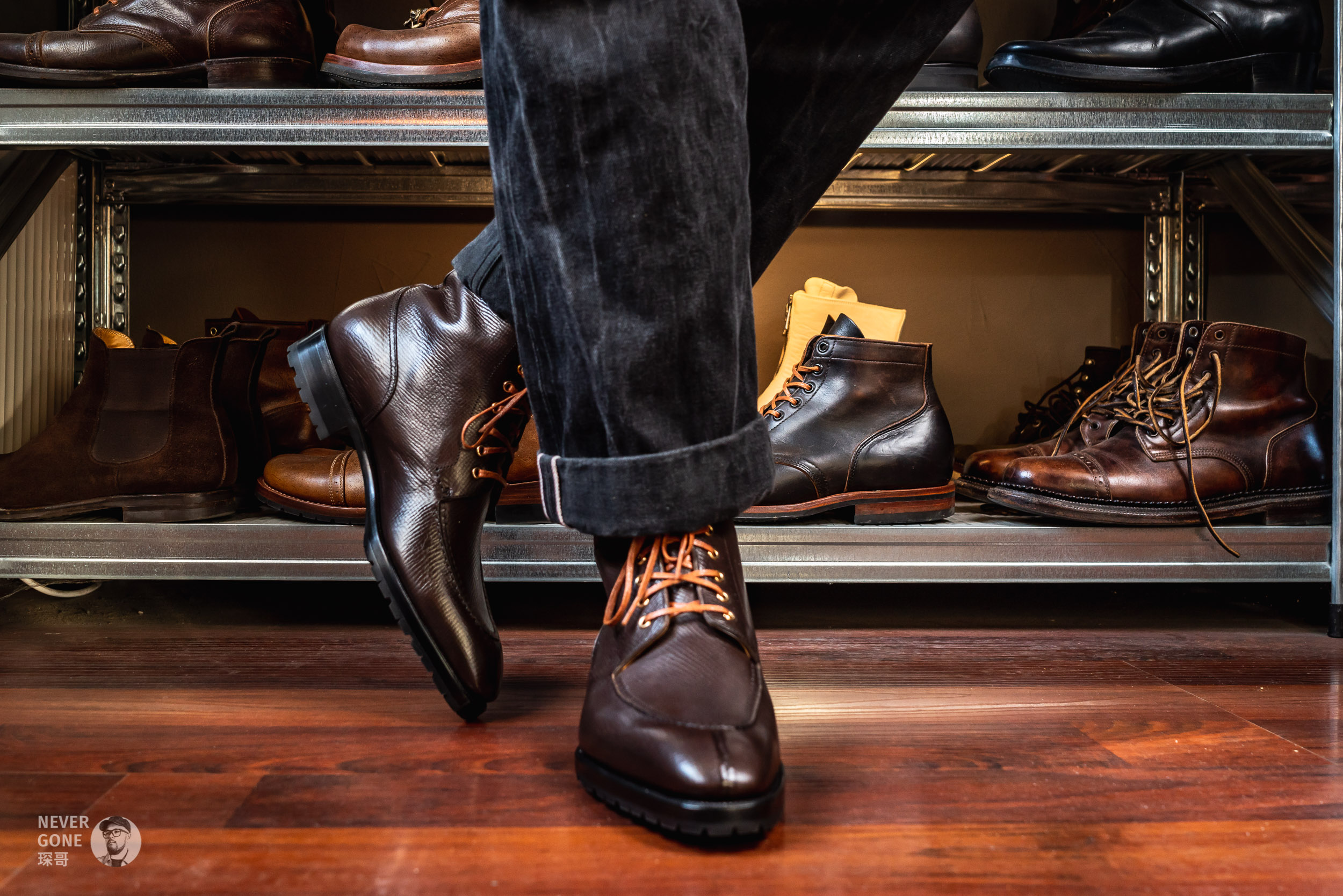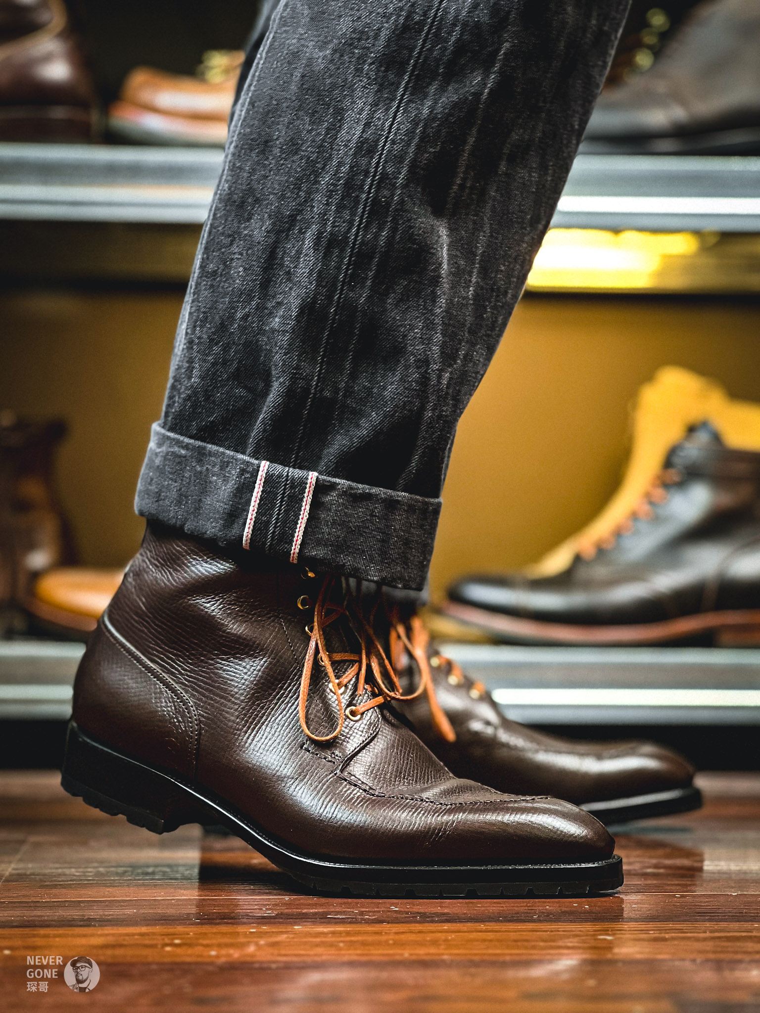 作为喜欢半工装半正装中间地带的靴子佬,我偏好粗犷与精致融合的东西。Utah这种纹路皮本身是属于比较村的,而且这个分裂头款式也比较村,所以我觉得琴底盲腰之类的不太搭这个风格。于是,我选择了普通的手缝沿条+Vibram金标狗牙底,并且加上了金色鞋眼,这样看起来我个人觉得更和谐一点