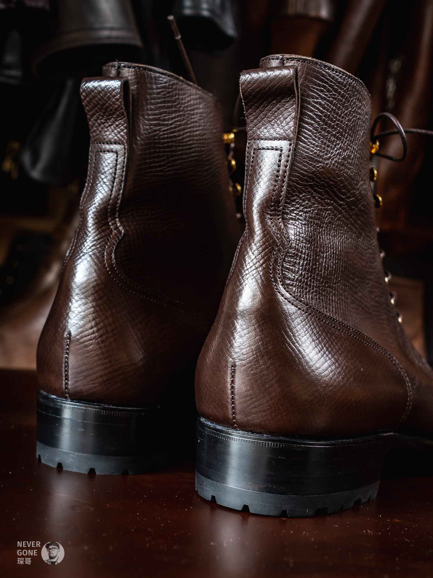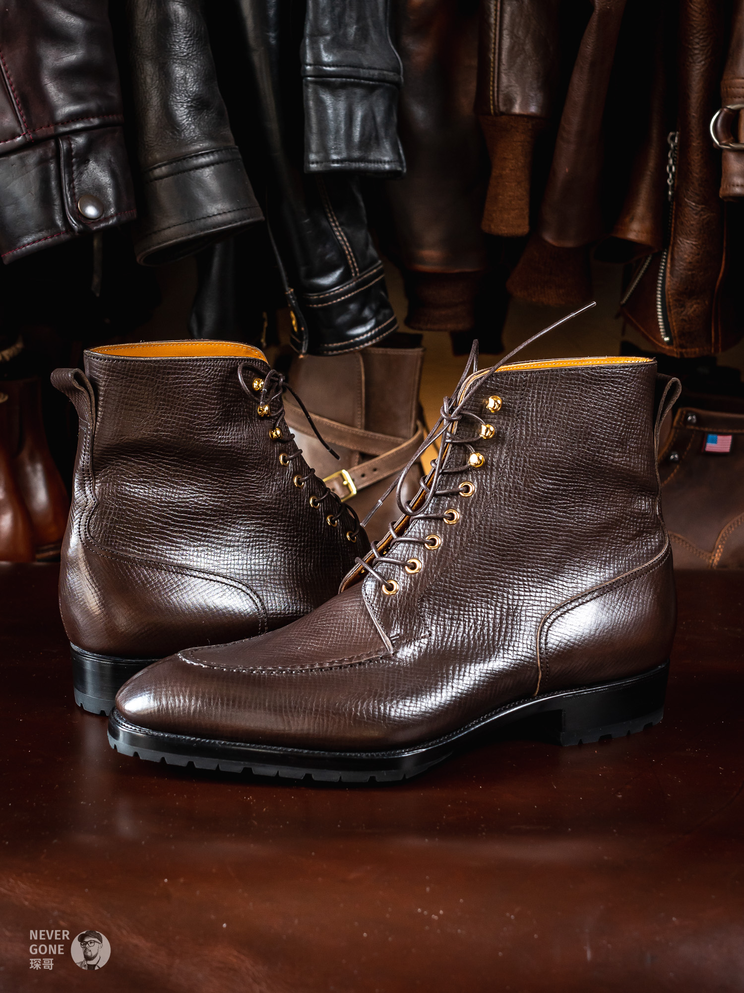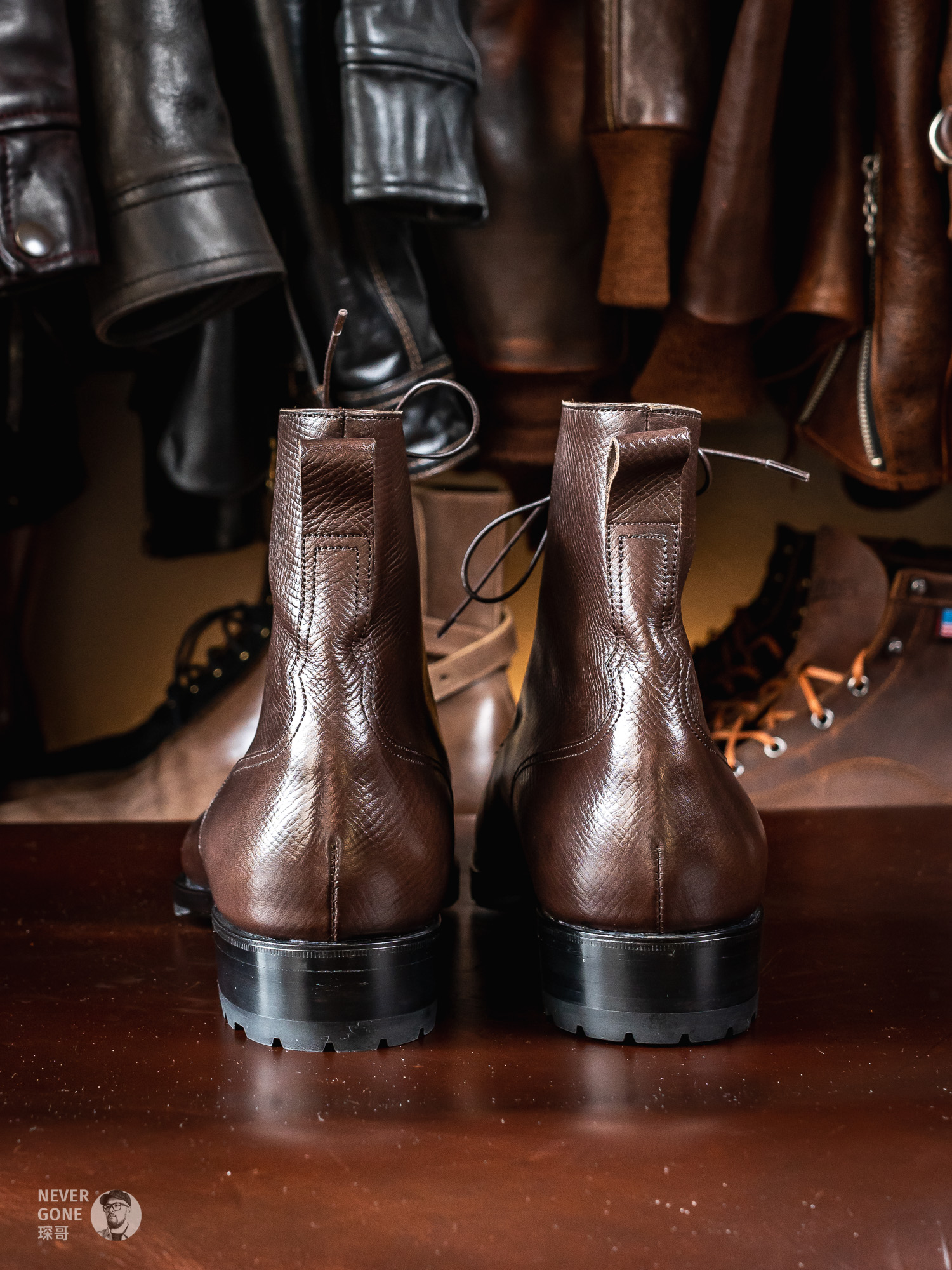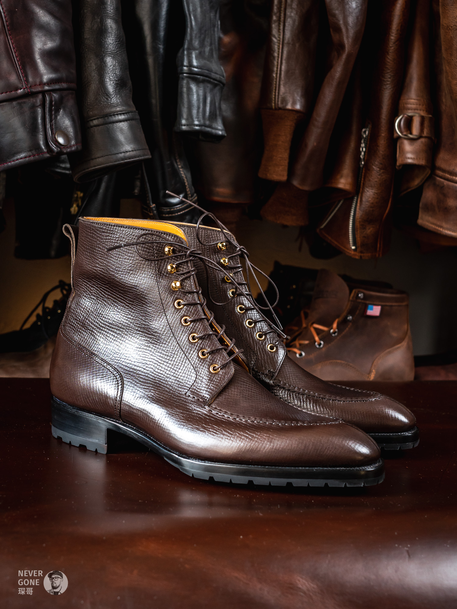 作为喜欢半工装半正装中间地带的靴子佬,我偏好粗犷与精致融合的东西。Utah这种纹路皮本身是属于比较村的,而且这个分裂头款式也比较村,所以我觉得琴底盲腰之类的不太搭这个风格。于是,我选择了普通的手缝沿条+Vibram金标狗牙底,并且加上了金色鞋眼,这样看起来我个人觉得更和谐一点