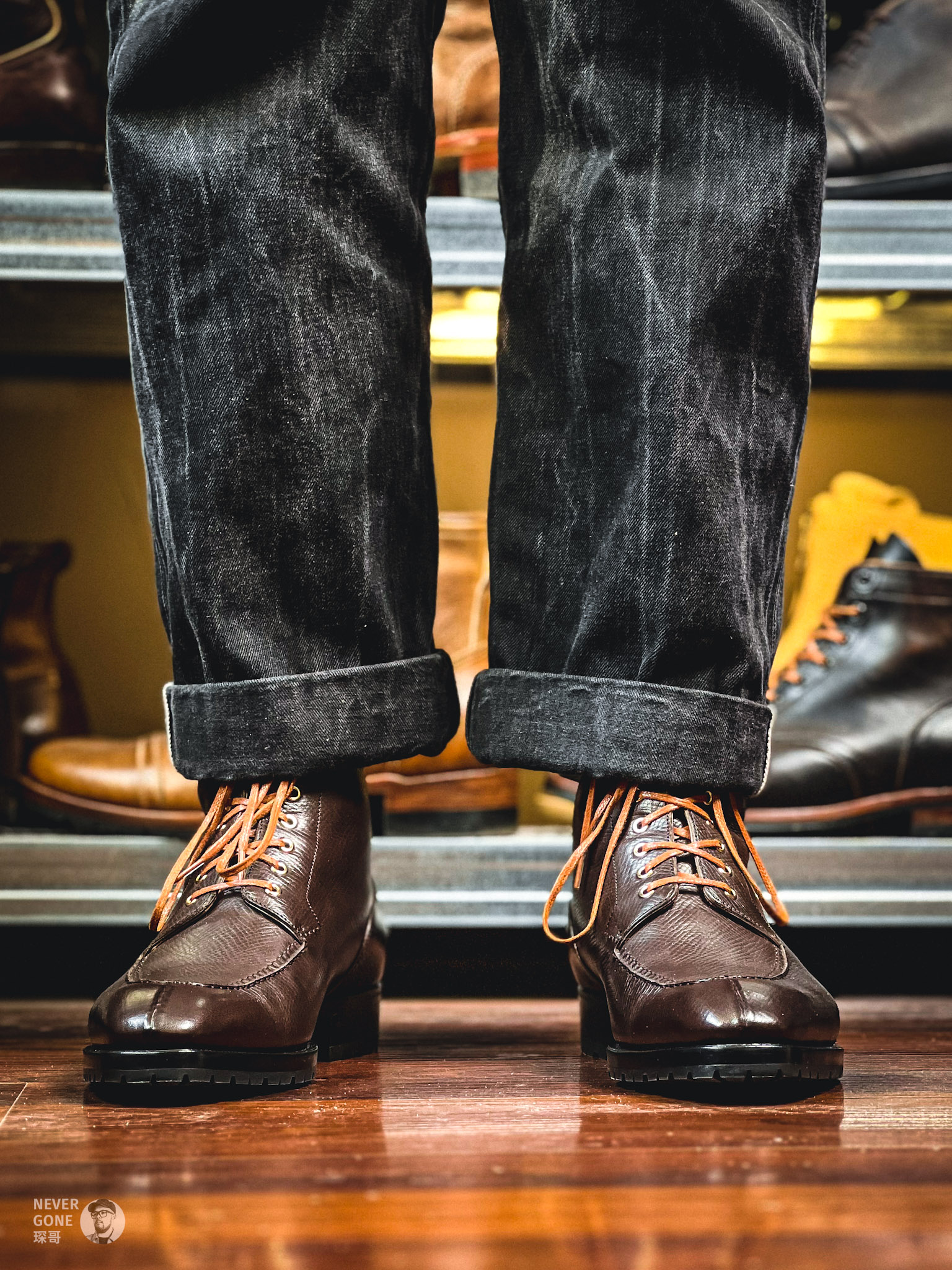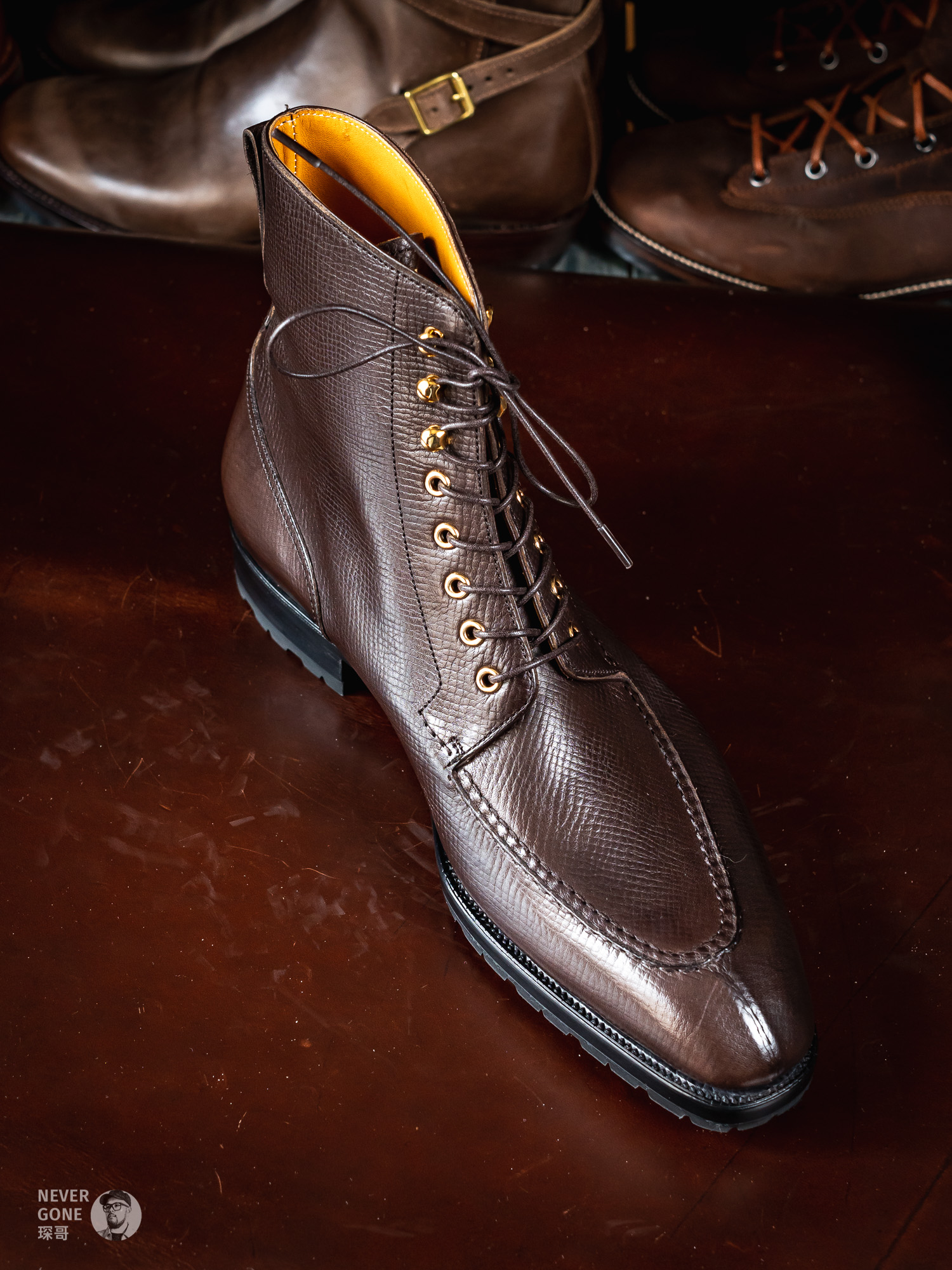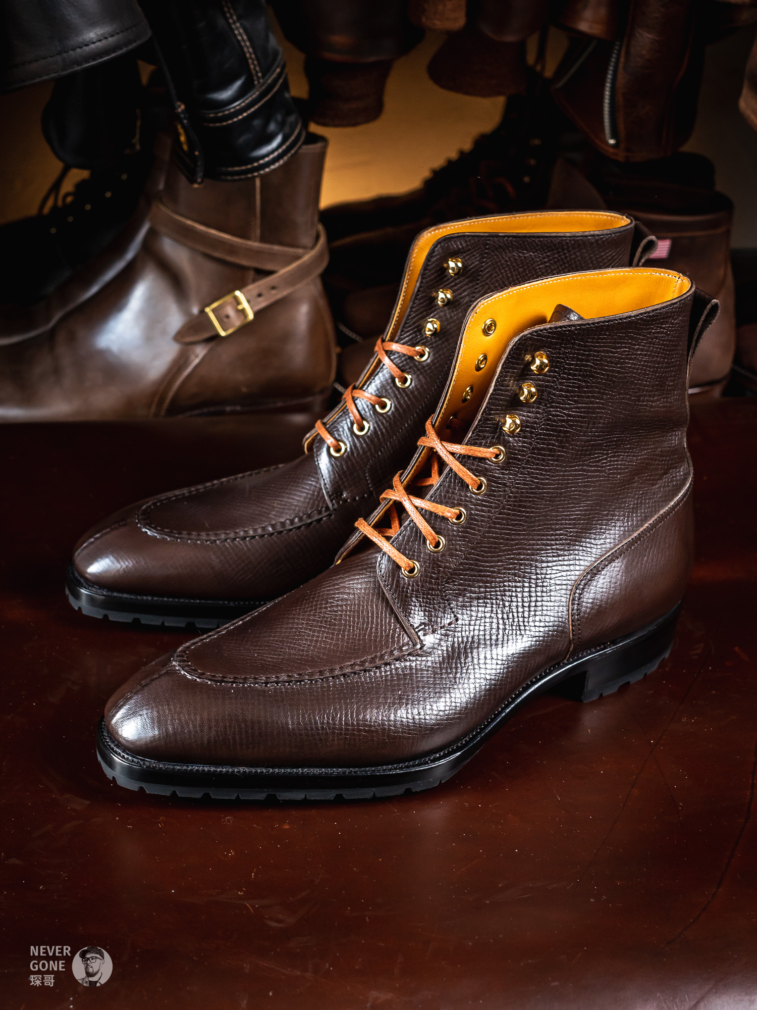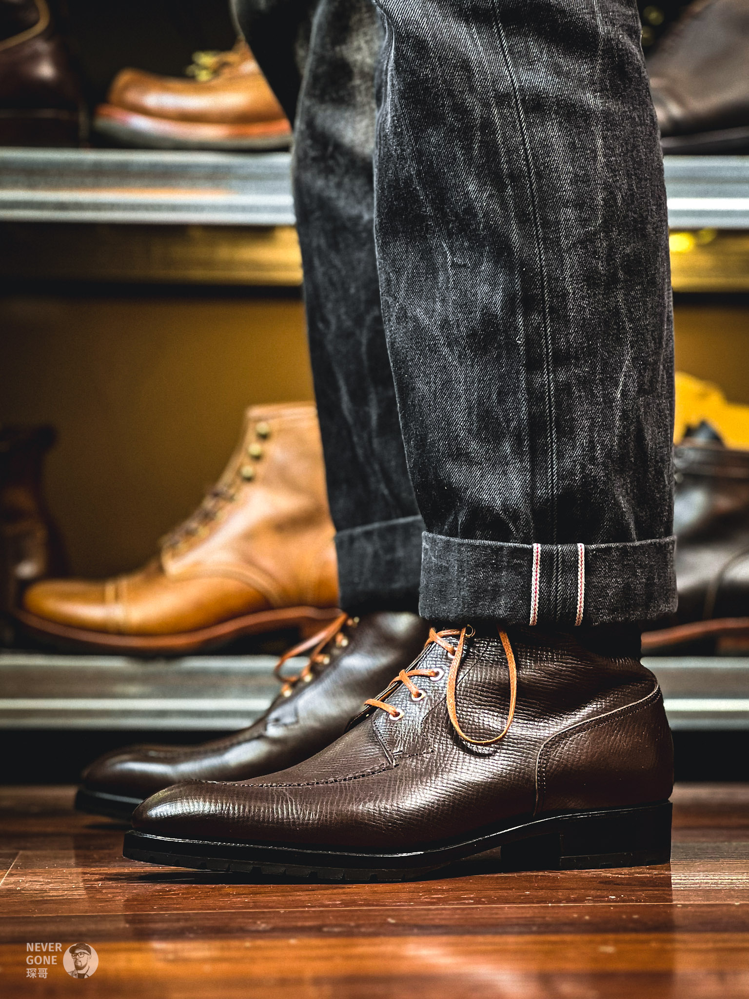 作为喜欢半工装半正装中间地带的靴子佬,我偏好粗犷与精致融合的东西。Utah这种纹路皮本身是属于比较村的,而且这个分裂头款式也比较村,所以我觉得琴底盲腰之类的不太搭这个风格。于是,我选择了普通的手缝沿条+Vibram金标狗牙底,并且加上了金色鞋眼,这样看起来我个人觉得更和谐一点