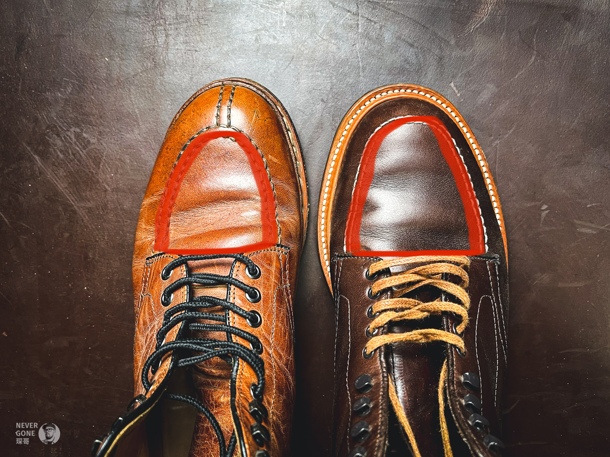 大部分缝制鞋品牌都会推出至少1款Split Toe,区别就是Apron是怎么缝的,以及Split的缝法和长度,再结合品牌自己的楦型、做工细节处理习惯,以及取个好记的名字,就形成了各品牌自家的款式。其中名气比较大的有Alden Tanker,Edward Green Dover等