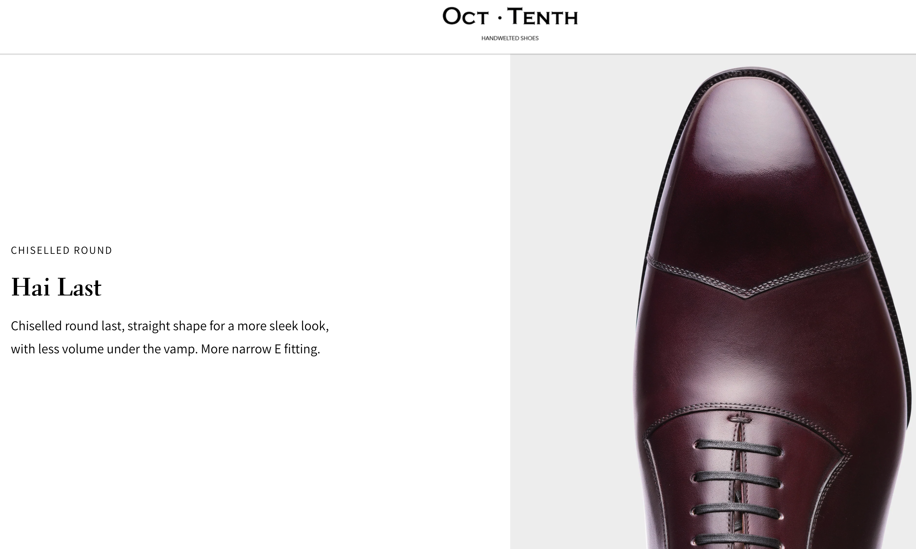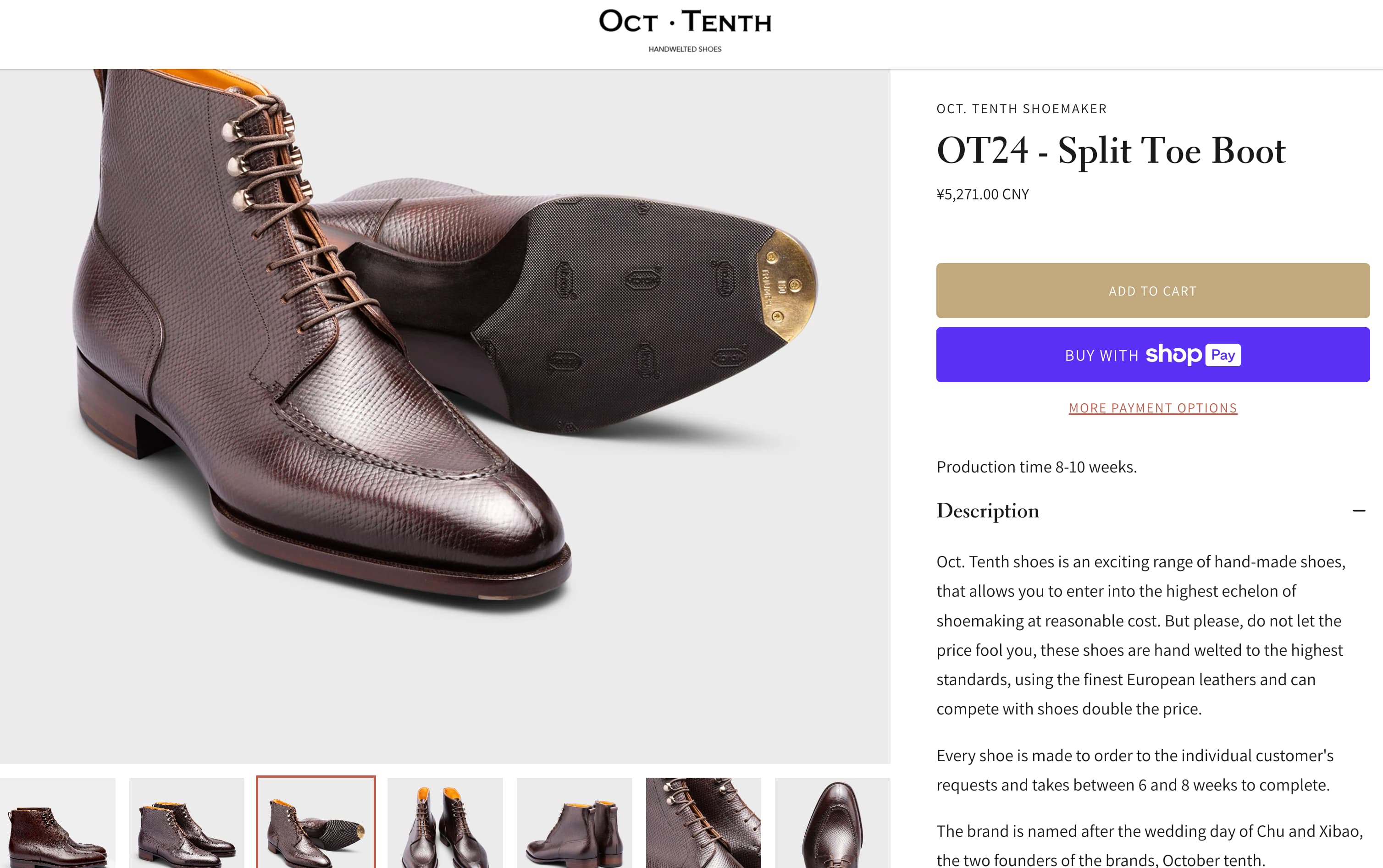 在Oct官网上翻到一款Split Toe,感觉挺喜欢的,于是我就简单改了下配置,然后下单了(图片里使用的是Pu楦,但我改成了小方头Huang楦,以及改变了工艺和外底,由此使得总价相比图片里的便宜了1000)