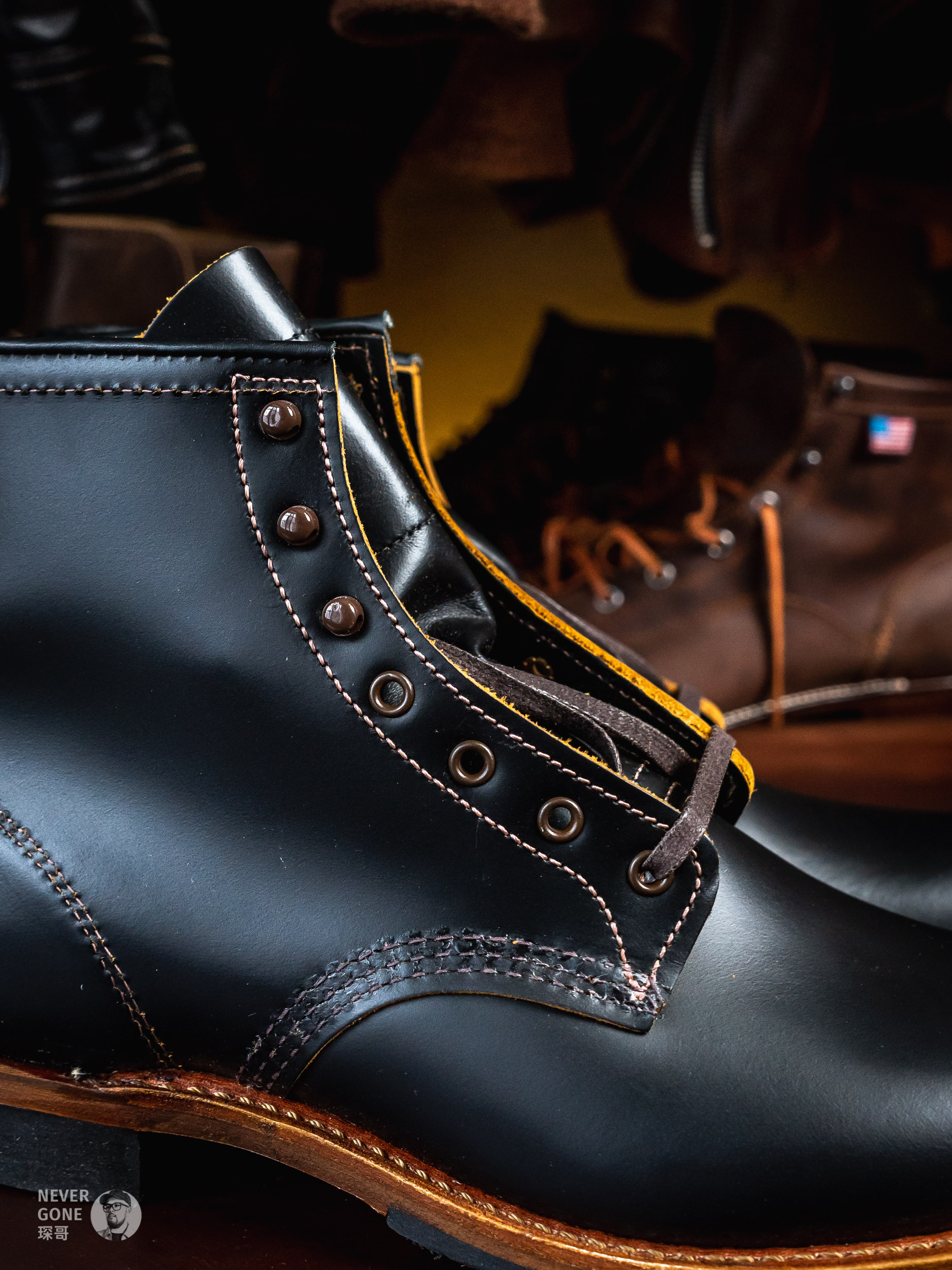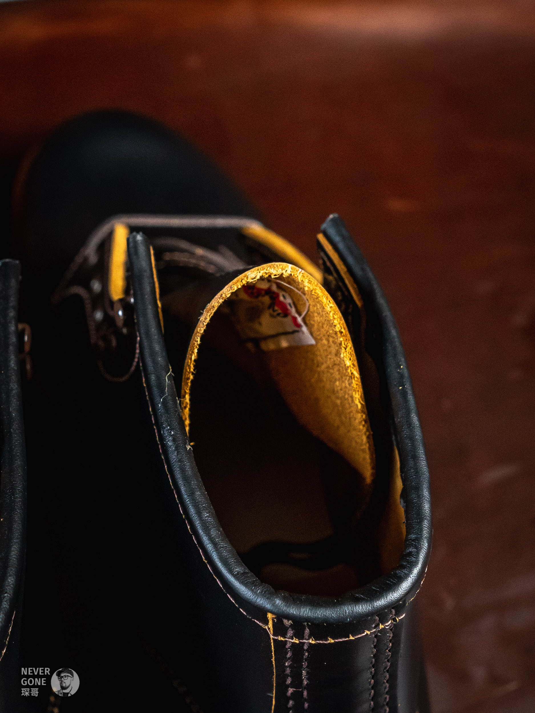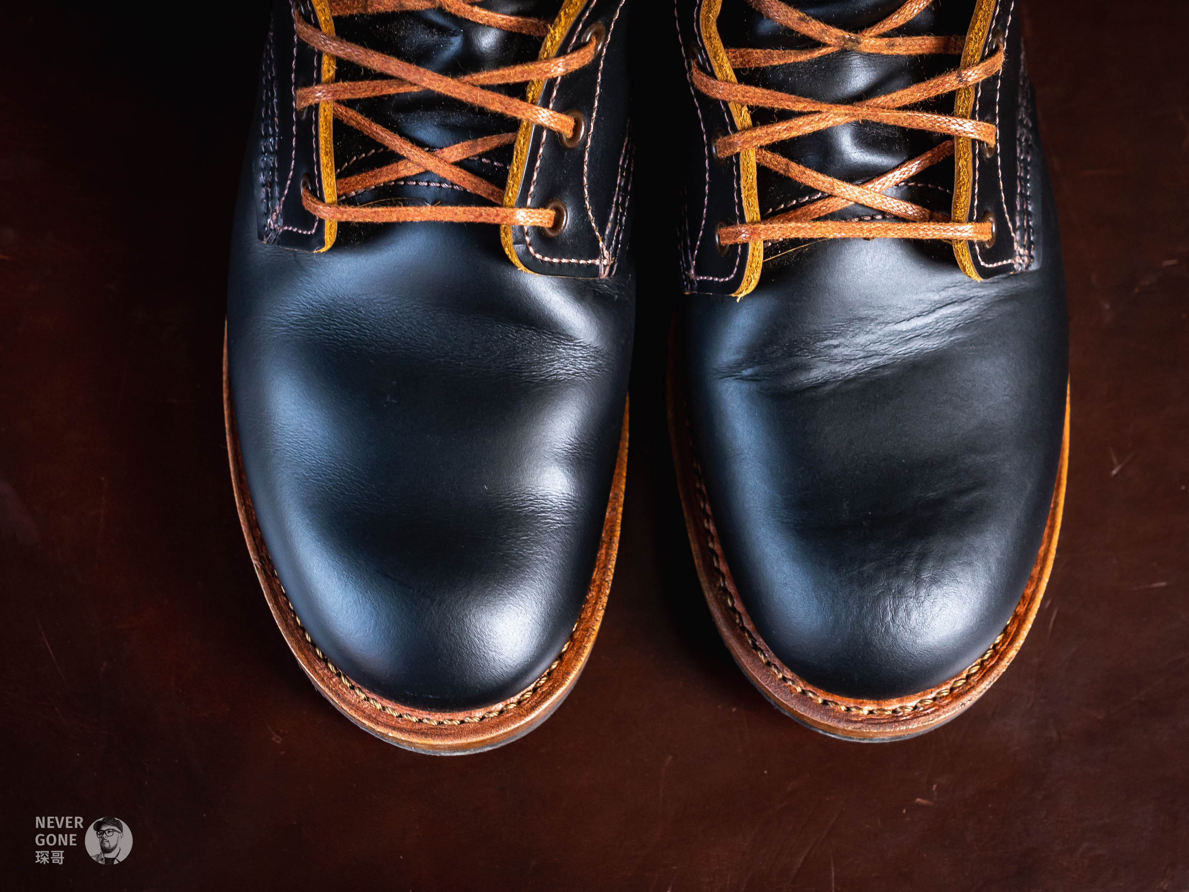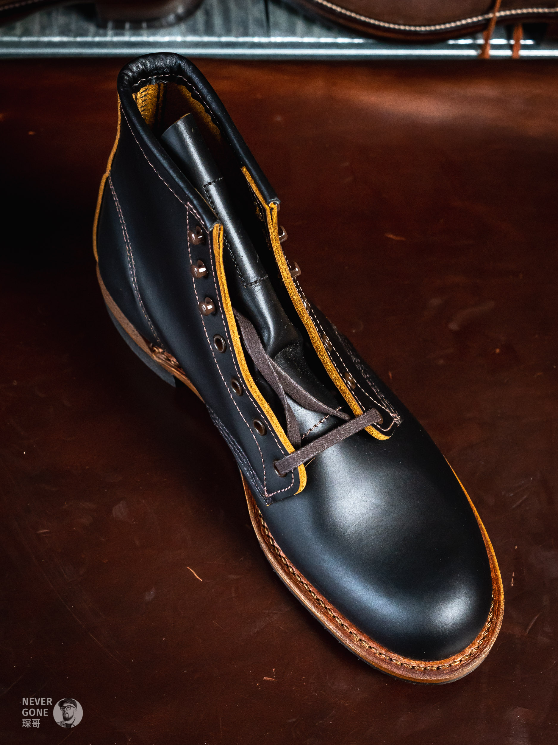 Beckman Flatbox复刻了当时不安装鞋头港宝的6英寸靴子。它们使用了与贝克曼相同设计的鞋面,并采用了相同的“8号”鞋楦。普通靴子的鞋头部分带有港宝,形状不会改变,因此皮革不会适应脚型,鞋底也不会翘起,但在 “无港宝扁头 ”设计下,没有被港宝固定的鞋头皮革可以根据脚型贴合,鞋底也可以自由弯曲,因此比普通靴子更舒适。 随着皮革的贴合,鞋头会变得更加平坦,呈现出独特的形状。这种设计在20世纪初到中期的美国靴子中很常见,“无港宝扁头”的魅力就在于它会随着时间的推移而变化,而且舒适