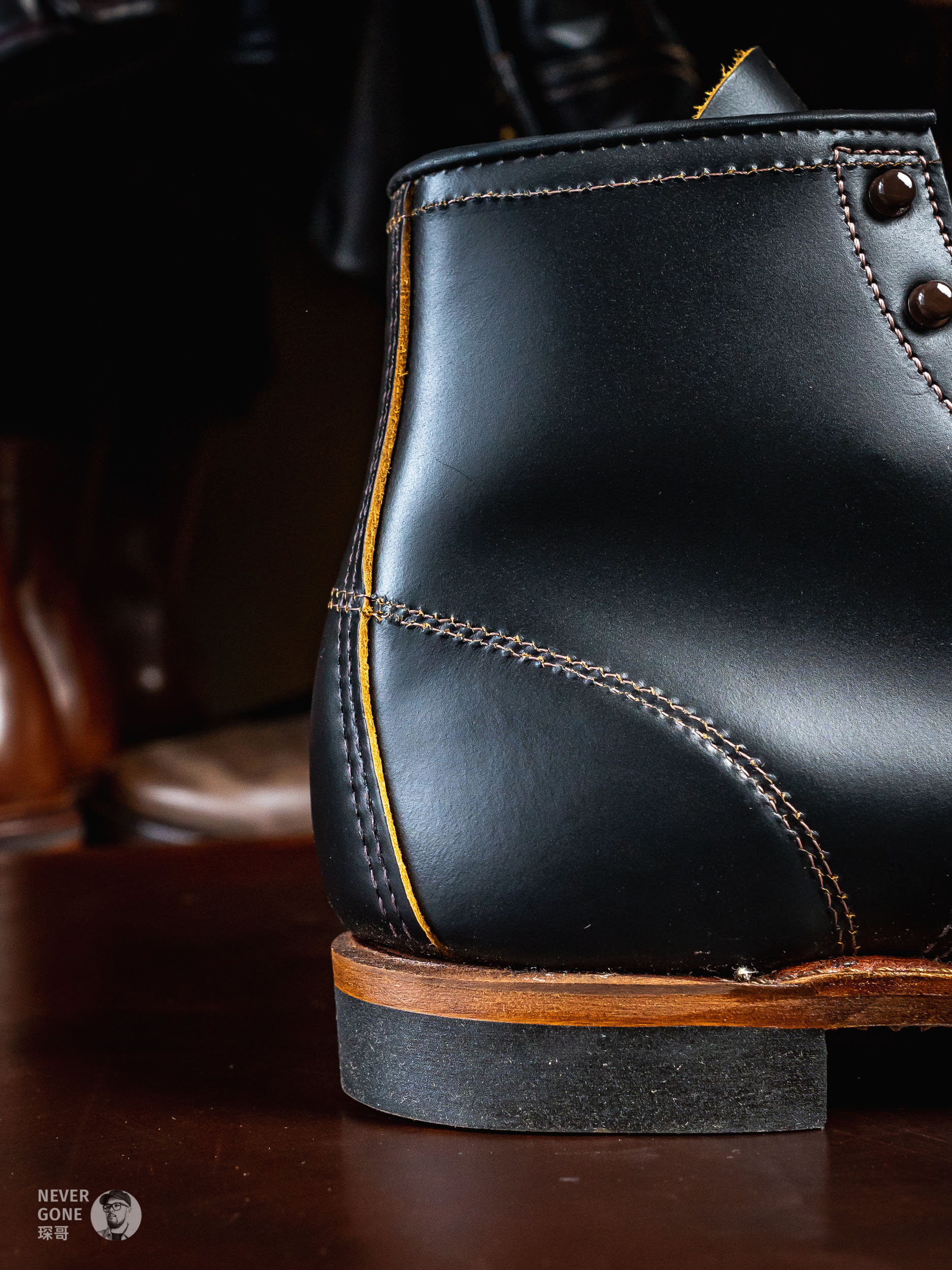 这款#9060使用的黑色Klondike是一种所谓的“茶芯”皮革,是将染成棕色的皮革覆盖黑色涂层而成。它也是对过去常见黑色皮革的再现。随着穿着,可以欣赏磨损处出现底层茶色的独特年代变化。