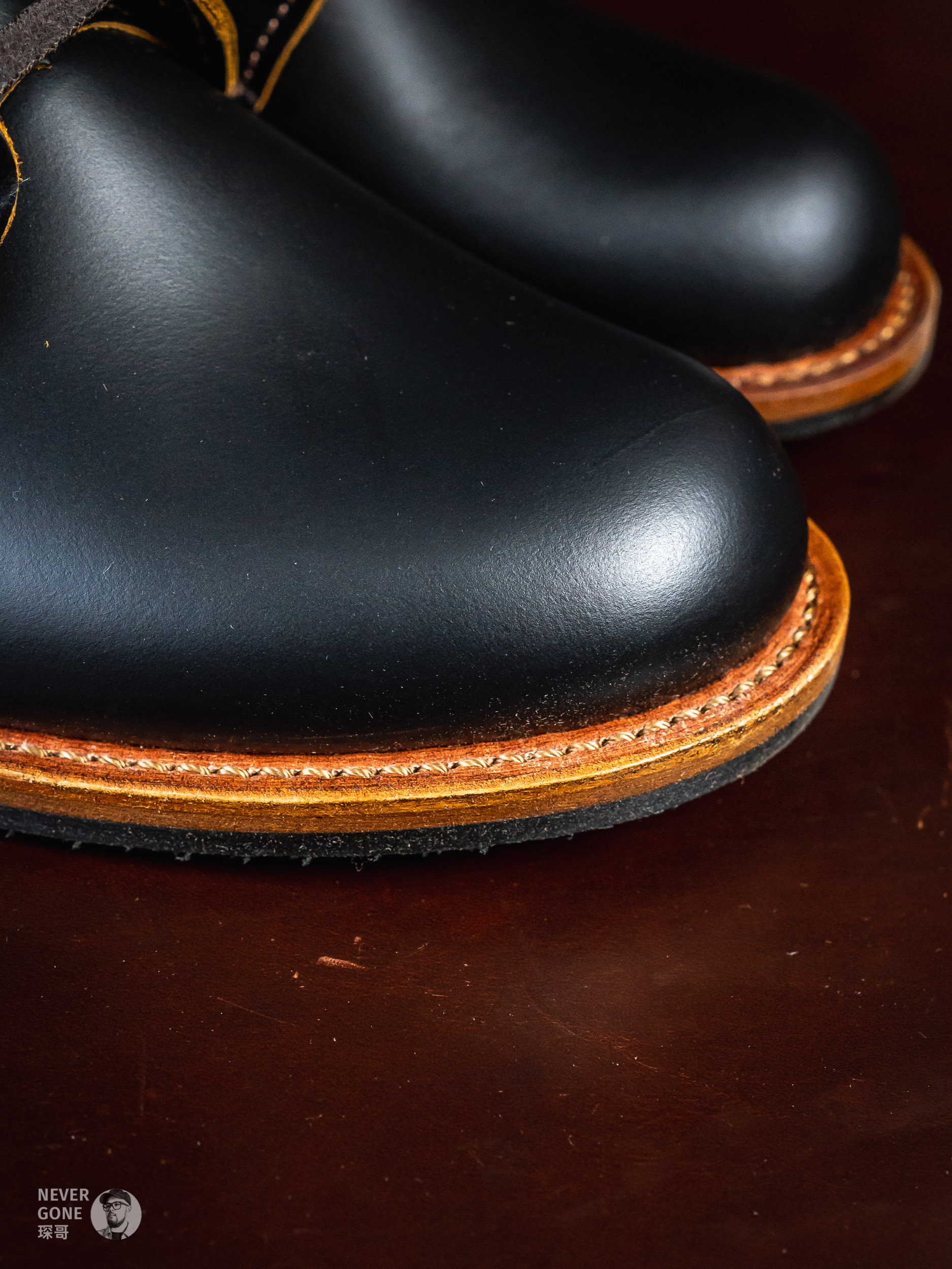 与之前鞋神改造的红翼9016摆一起拍照还蛮有意思的,都是扁头,但是9060新鞋没那么扁。等穿旧了自然塌下去后,会变扁一点。9060这种涂层厚的皮,估计得很大力才能有茶芯了