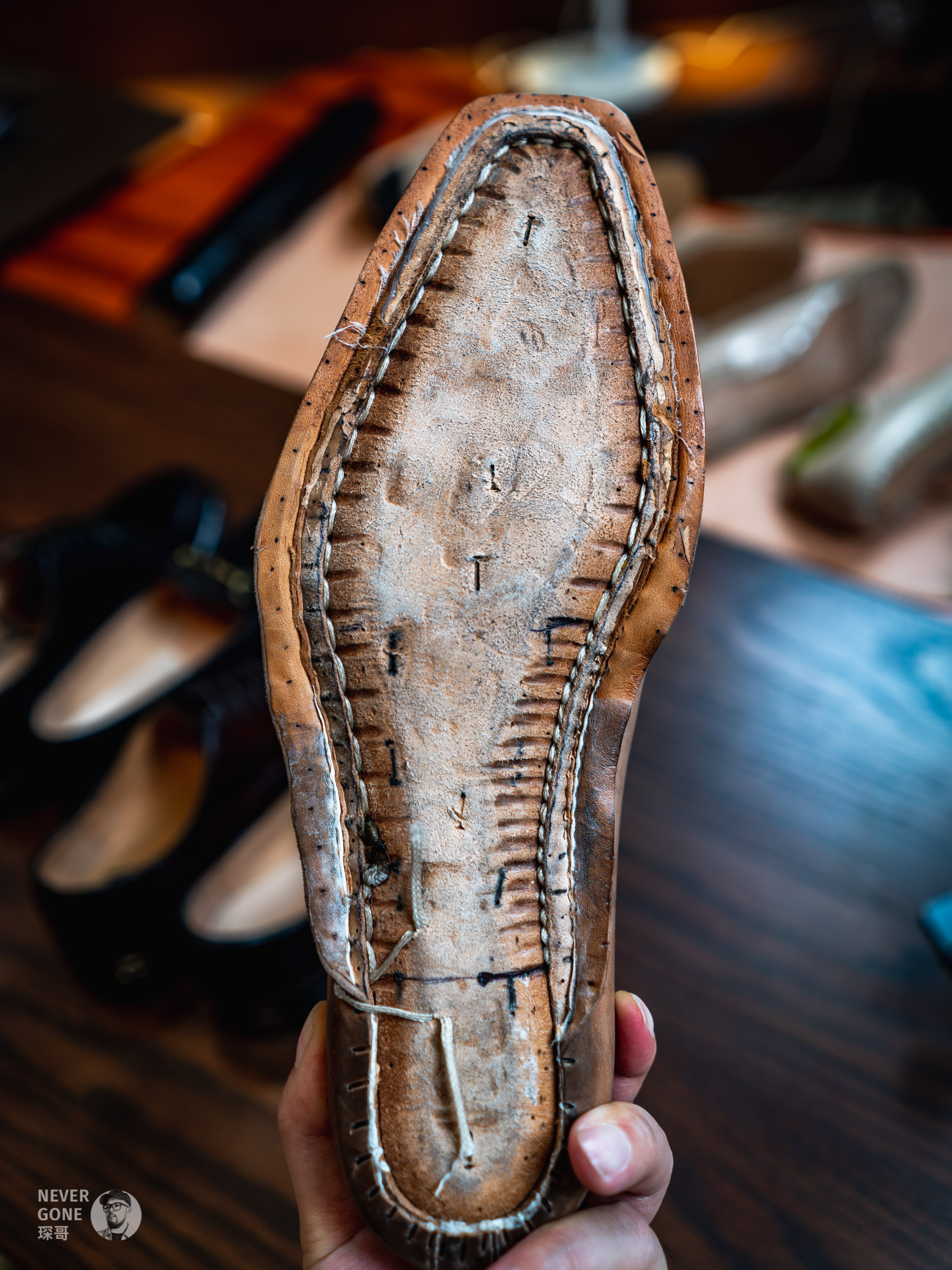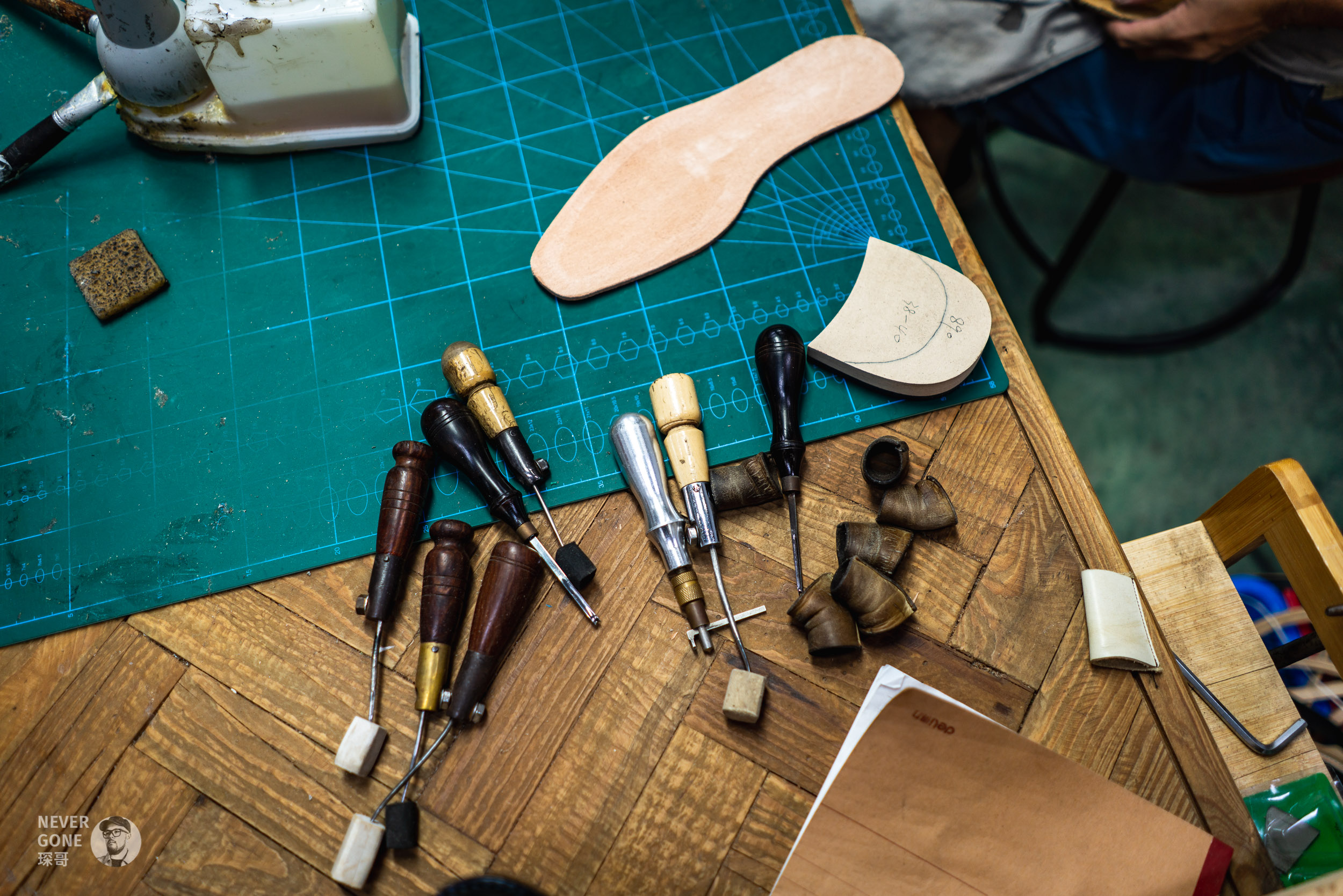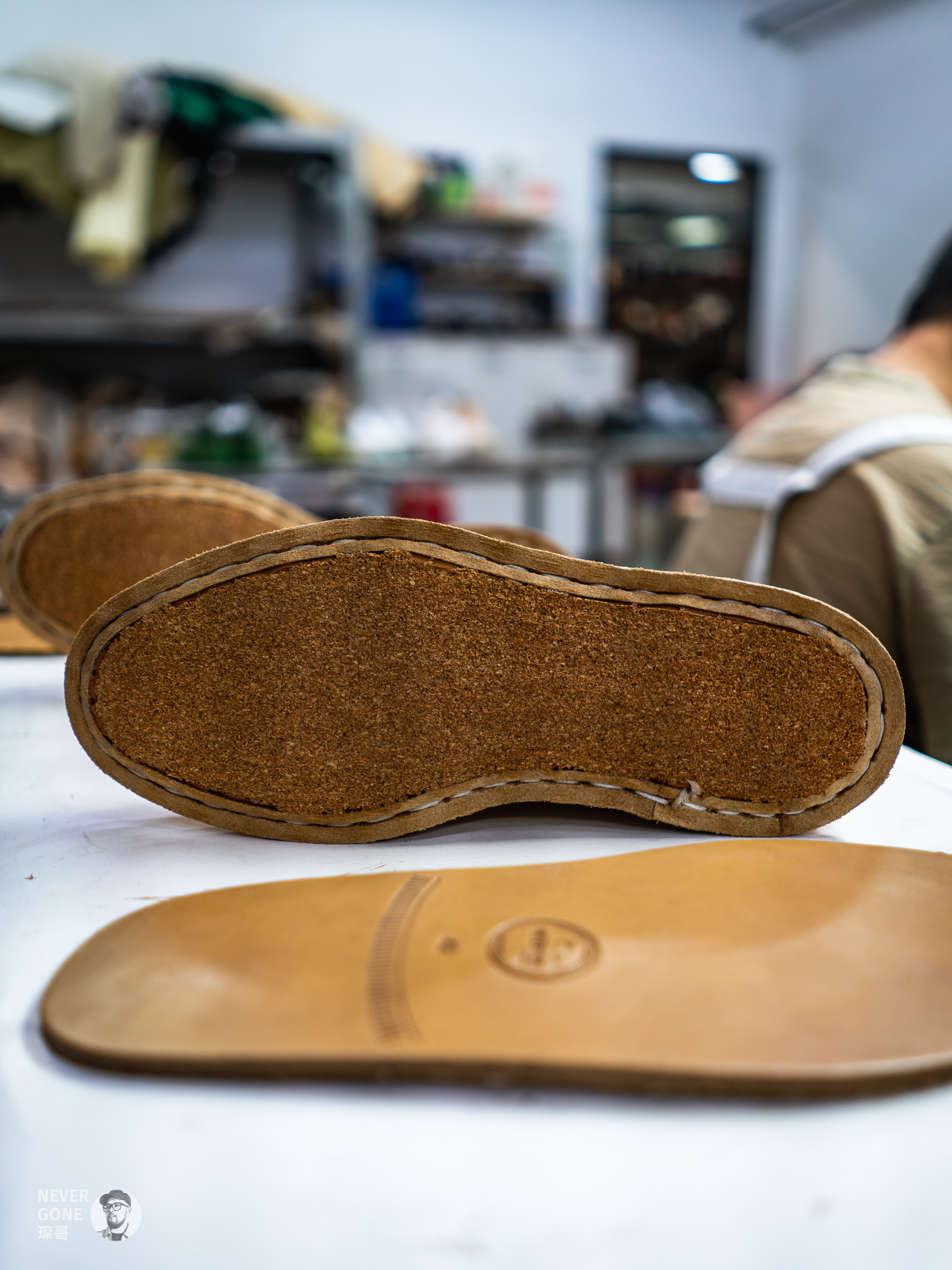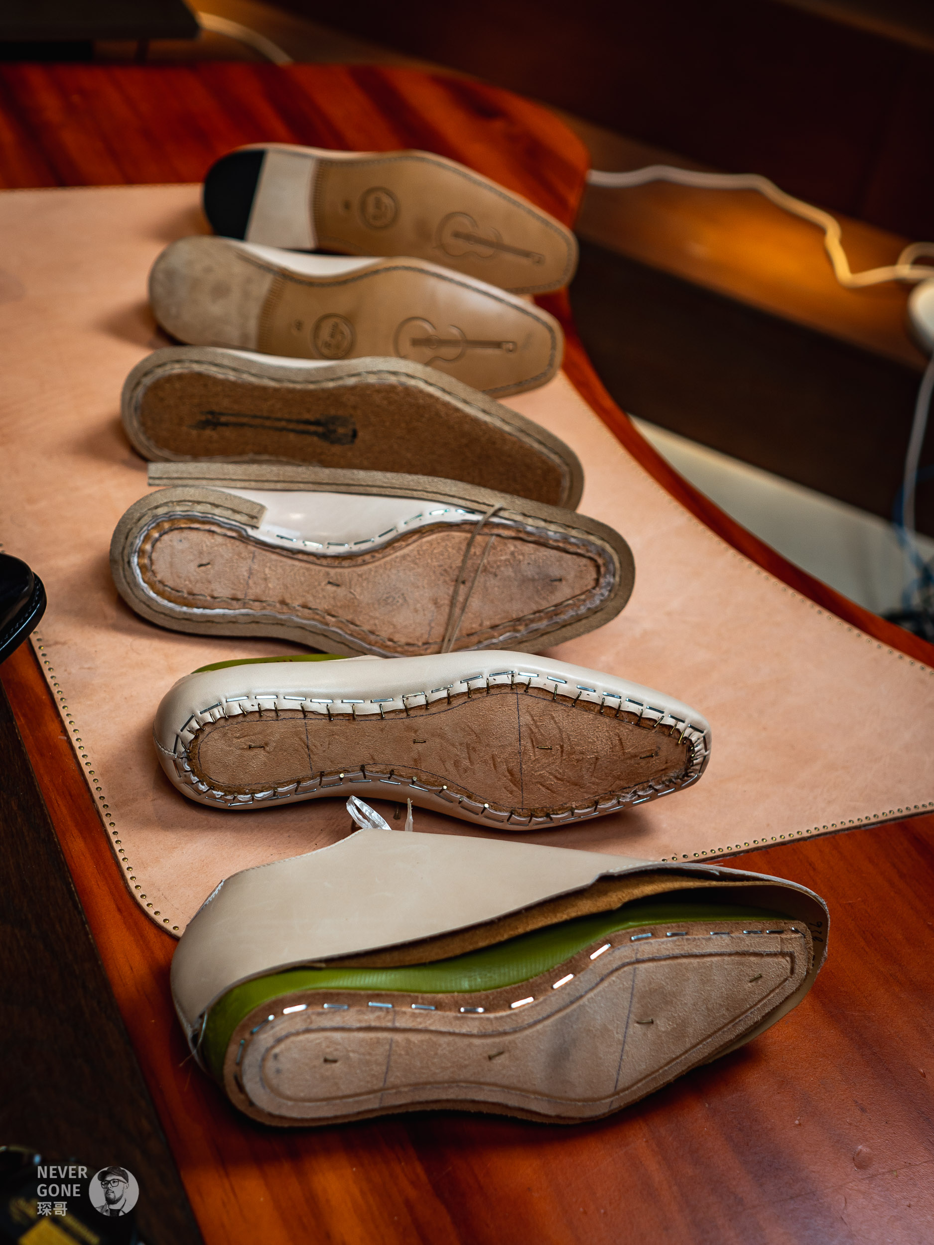 因为全手缝,所以用到的机器很少,就后踵定型机,压机,砂轮机之类的