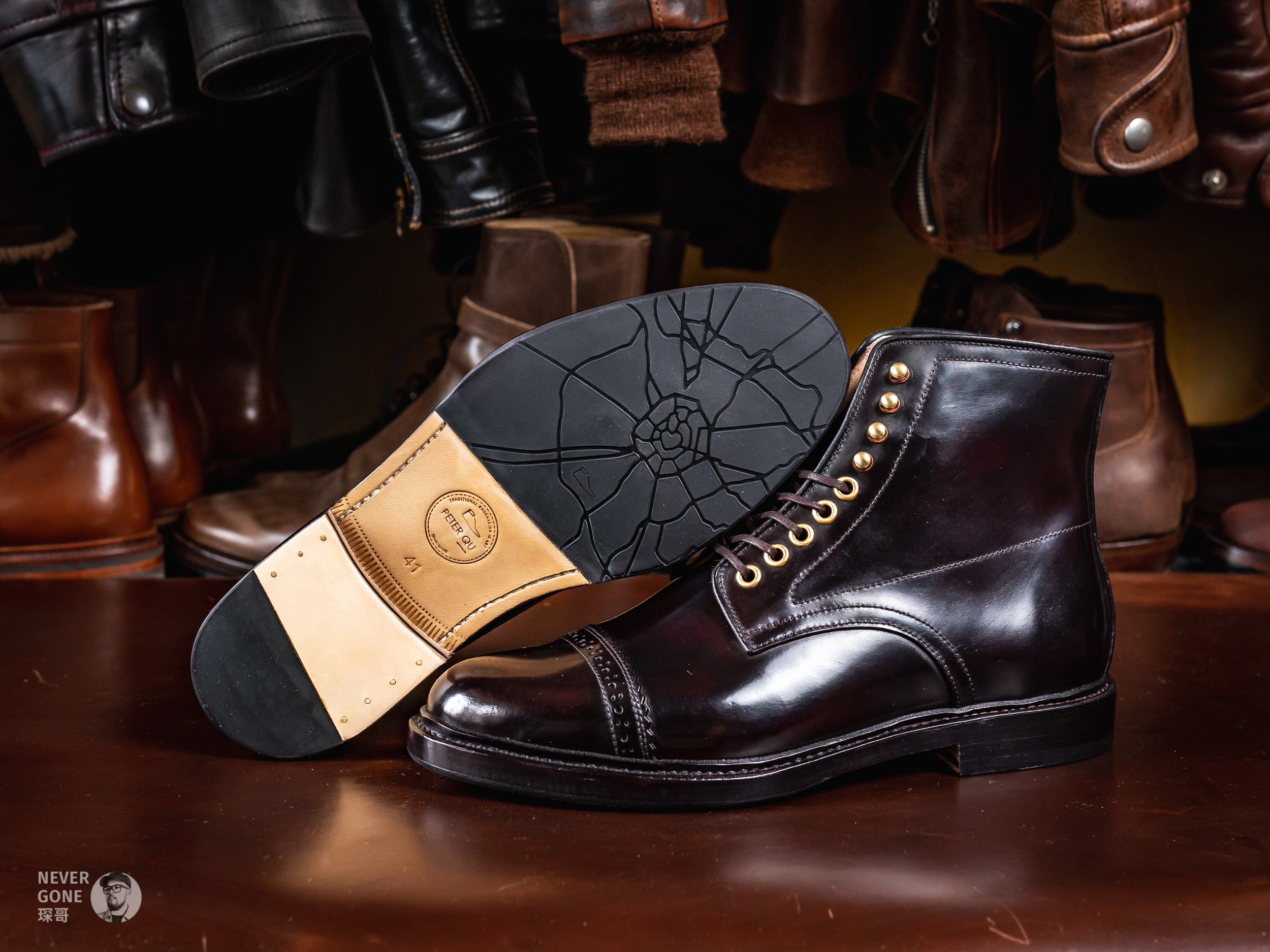 如果让玩鞋的朋友说一个主打马臀皮的鞋靴品牌,估计很多人会想到Alden。但国内品牌的话,能让人形成这种印象的则几乎没有。这次探厂的PETER QU是国内一个主打马臀皮的品牌,全线产品采用手缝沿条/内线/外线,有很多半工半正的款式,感觉还蛮有意思的