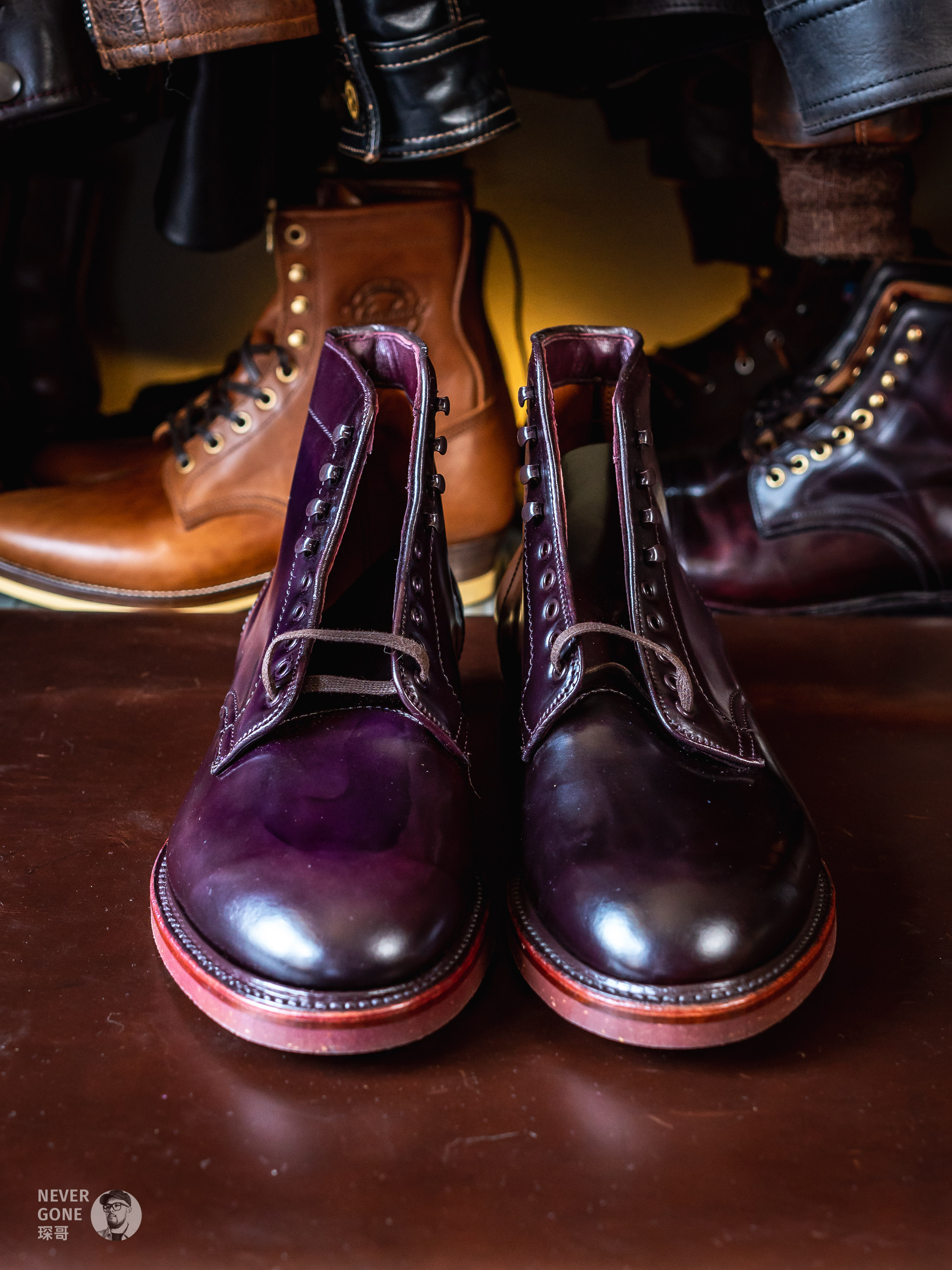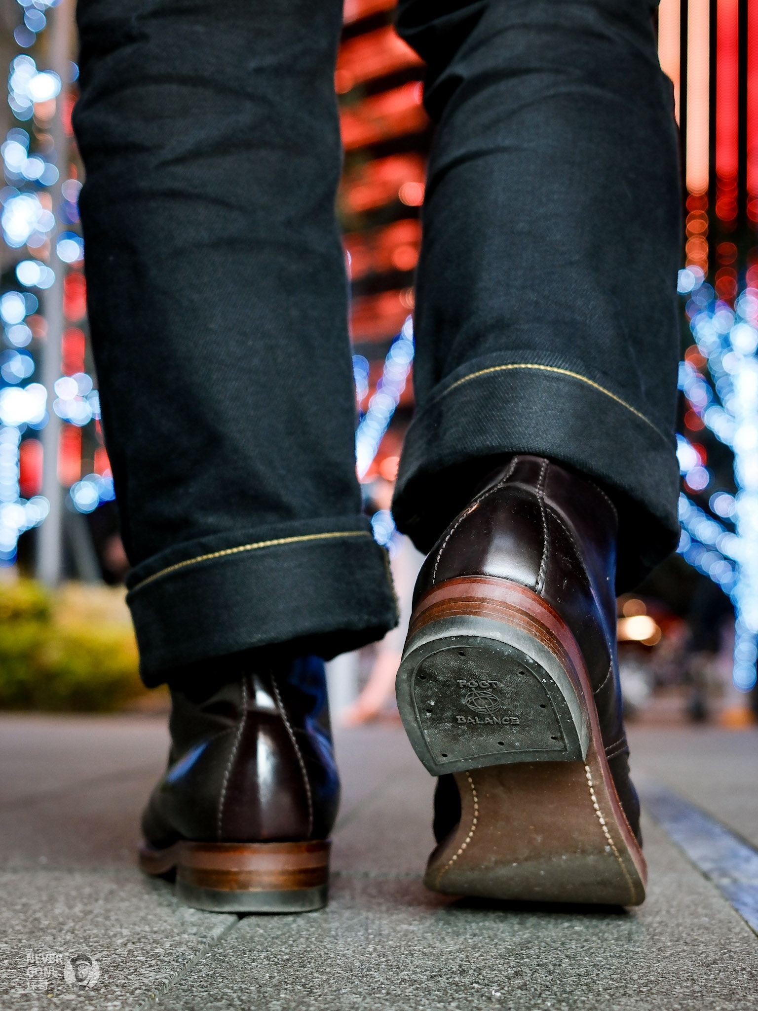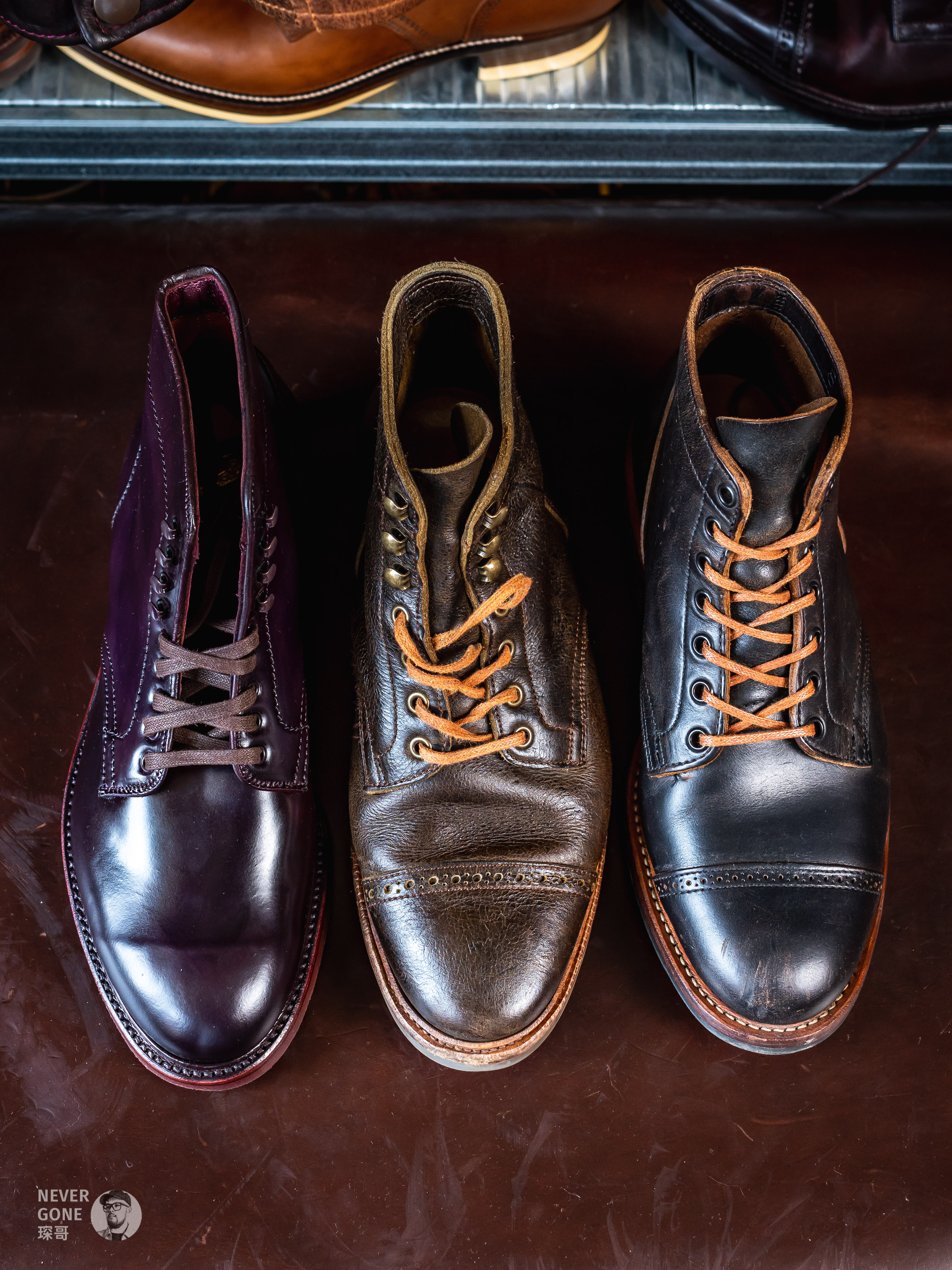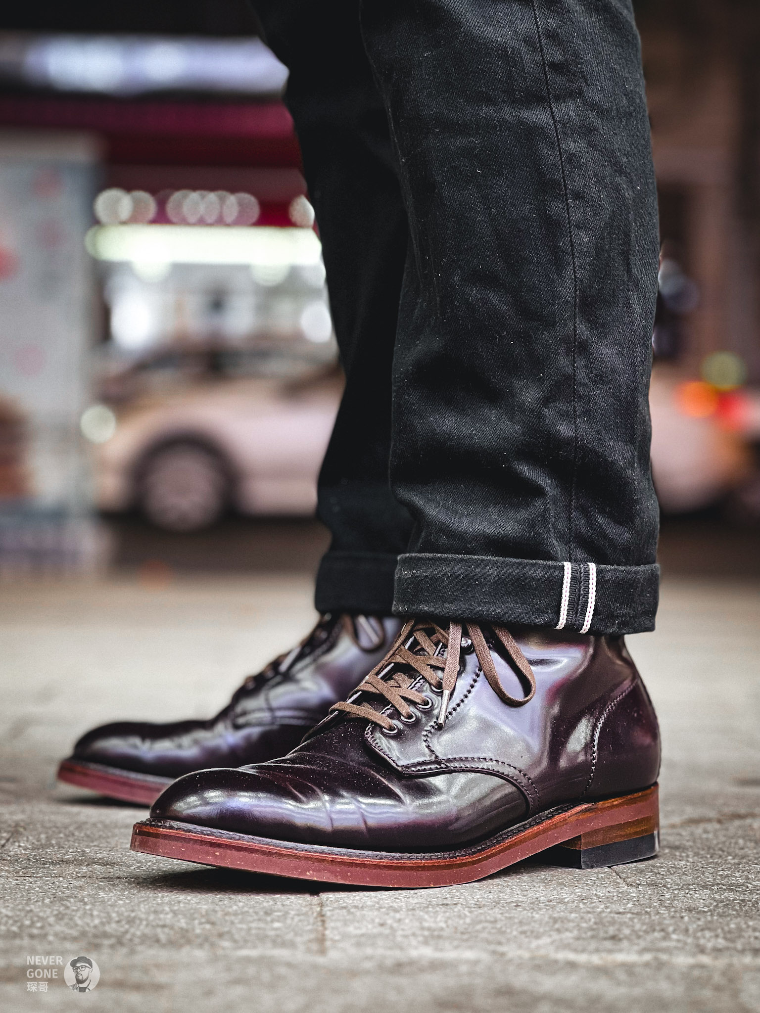 试穿了一下觉得还挺合脚的,M楦确实比较适合大部分人,不仅仅是亚洲人。主要体现在鞋腰和后跟比常见的Alden B楦、Viberg 2030这种收的更紧,贴合度更好,也更跟脚