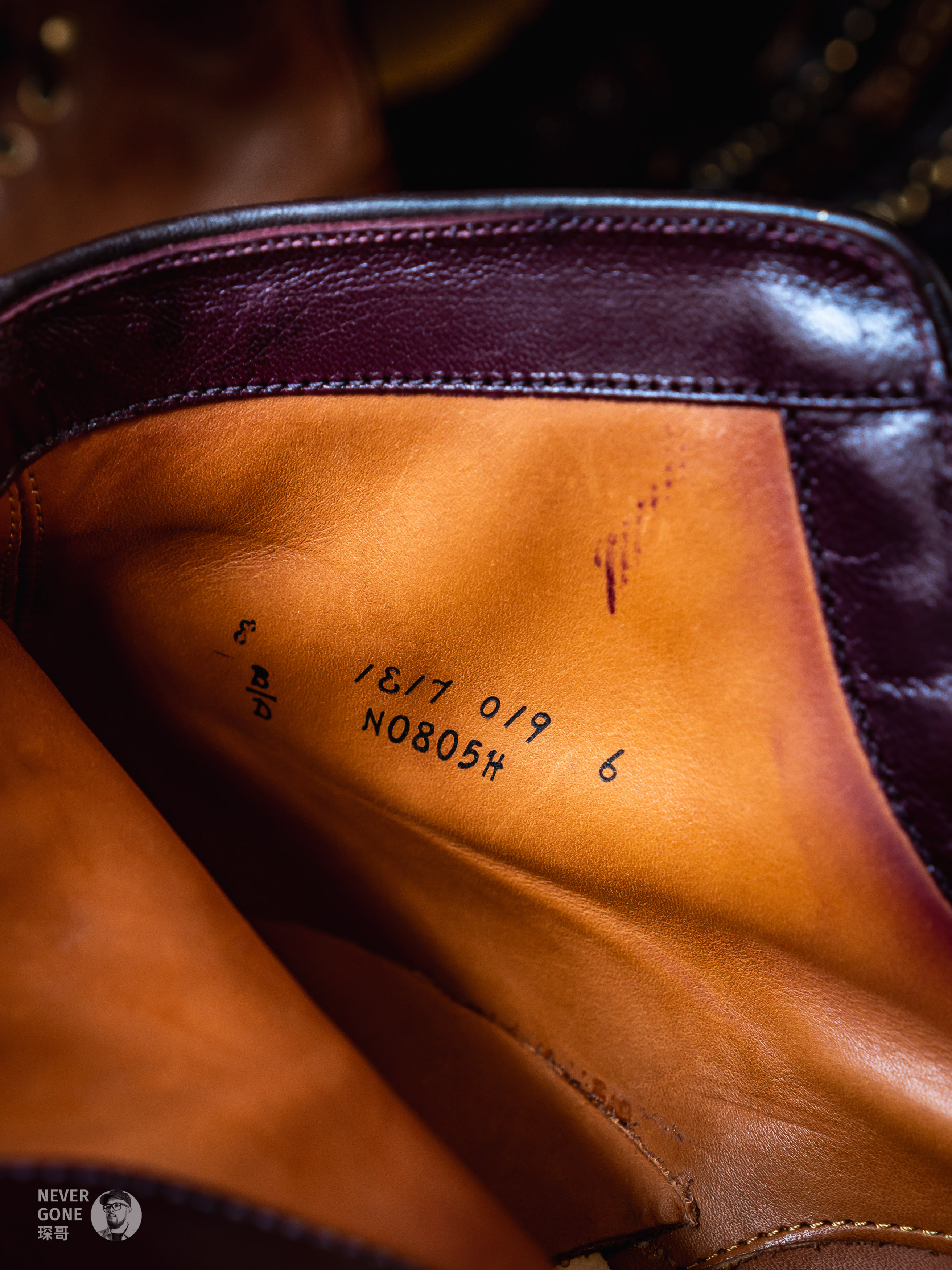 熟悉的内衬和编号,从左往右,8 B/D表示是美码US8,前掌围度D后跟围度B。N0805H,N代表出货给日本市场,0805表示是2010年出品的一双Plain toe靴子,H表示Hooks也就是快扣