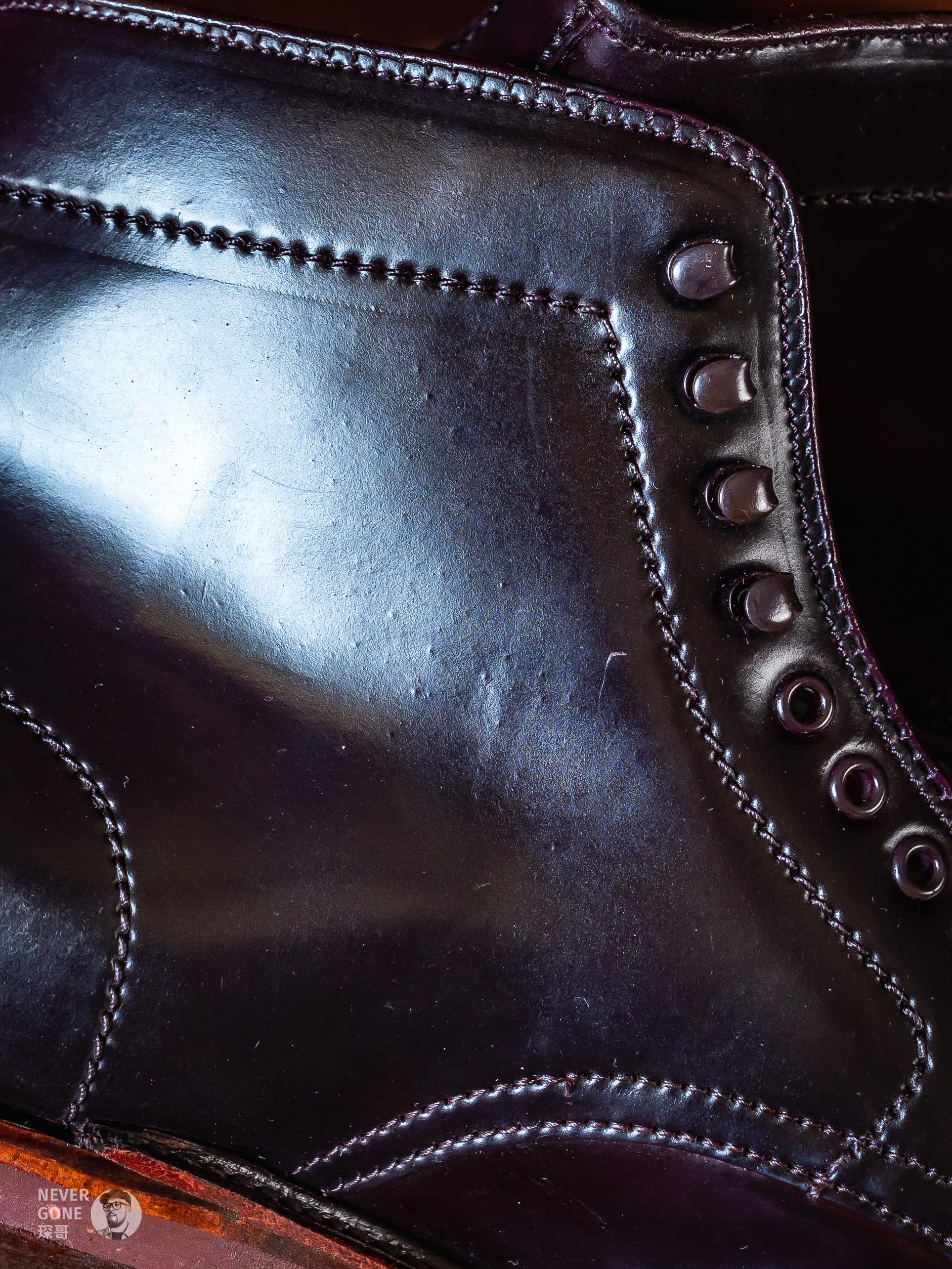 Alden的马臀镀层,远看显得非常亮,能盖住马臀原本的质地以及一些瑕疵,但细看就能看到马臀的毛囊孔,如果是浅色马臀,则会更加明显