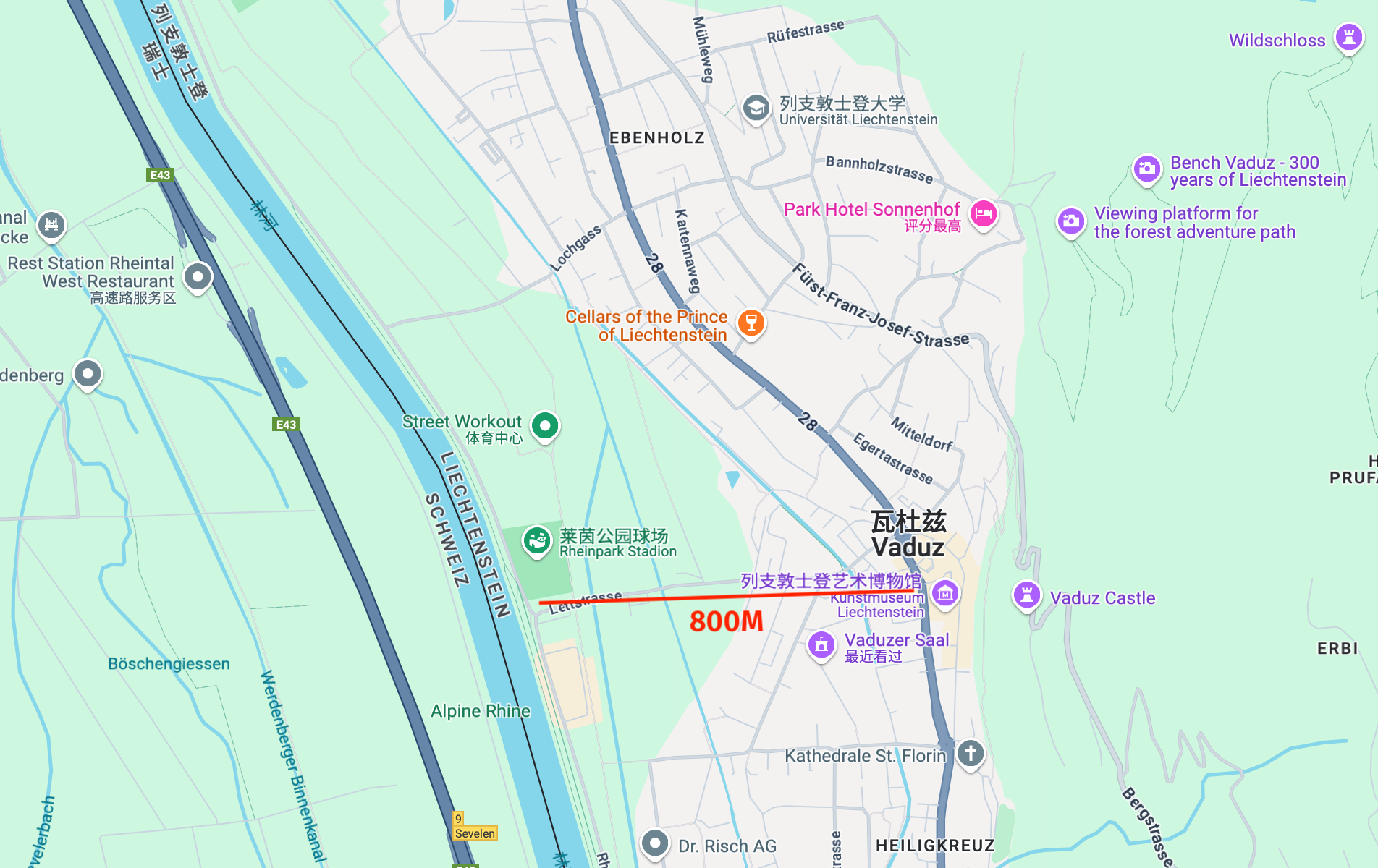 瓦杜兹总面积17平方千米,实际上市区只有4平方千米的样子,而市中心感觉就跟5个普通学校操场差不多大,从市中心往西走到莱茵河(林河)不过800多米,过了莱茵河就“出国”来到瑞士了