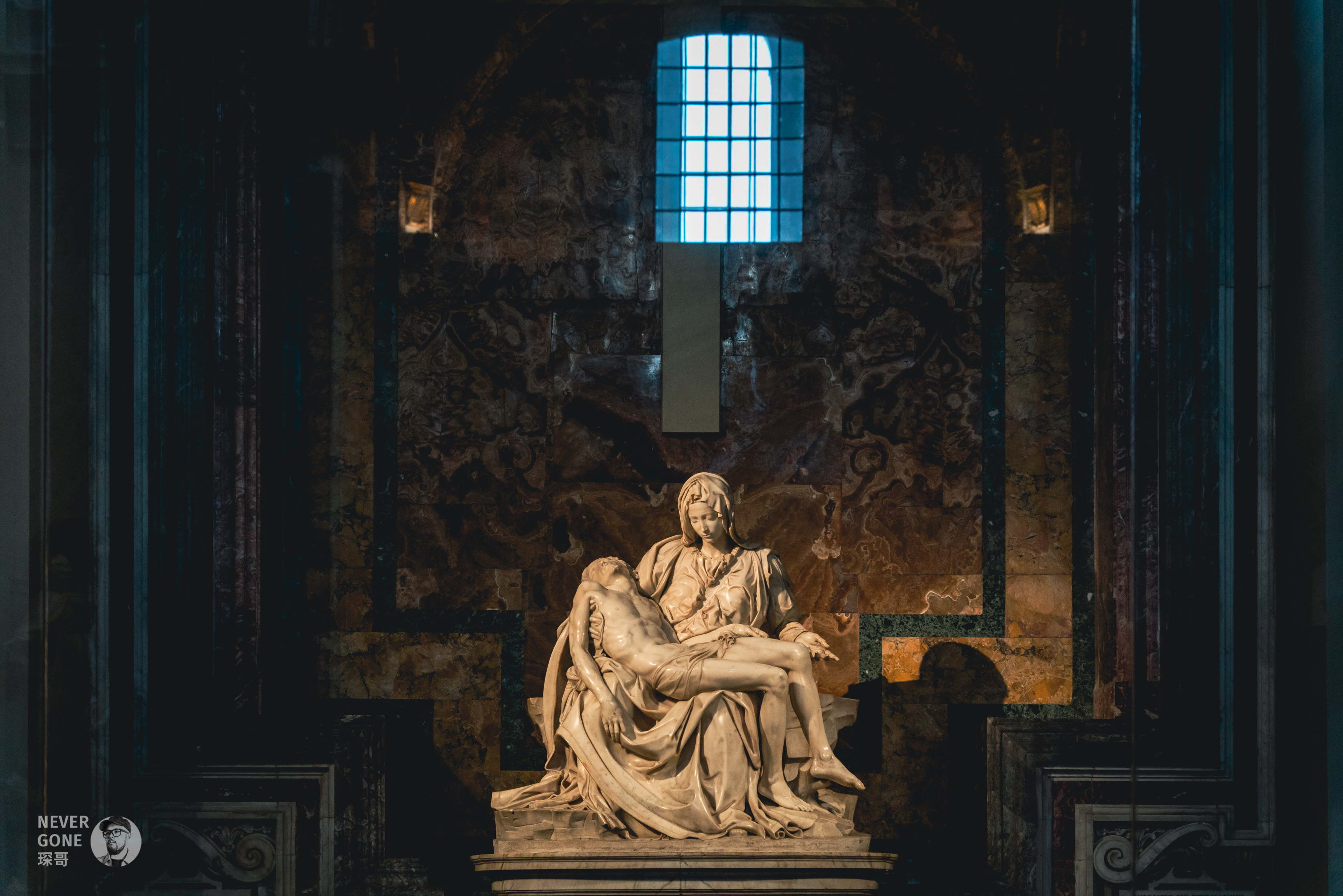 米开朗基罗《圣母哀痛耶稣之死》,怀里是耶稣,圣母雕像被狂热者毁坏过,后来修复了,也加强了安保