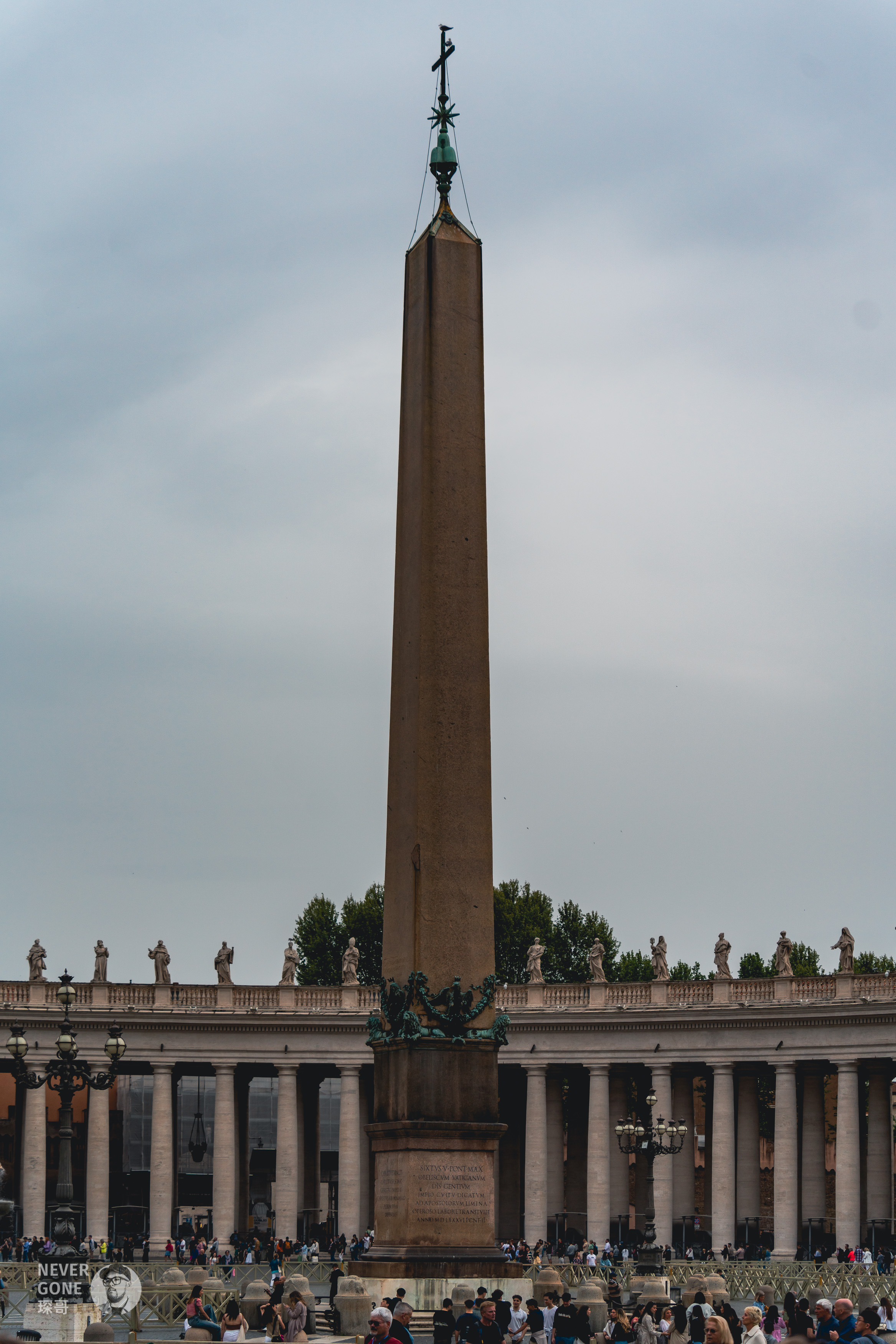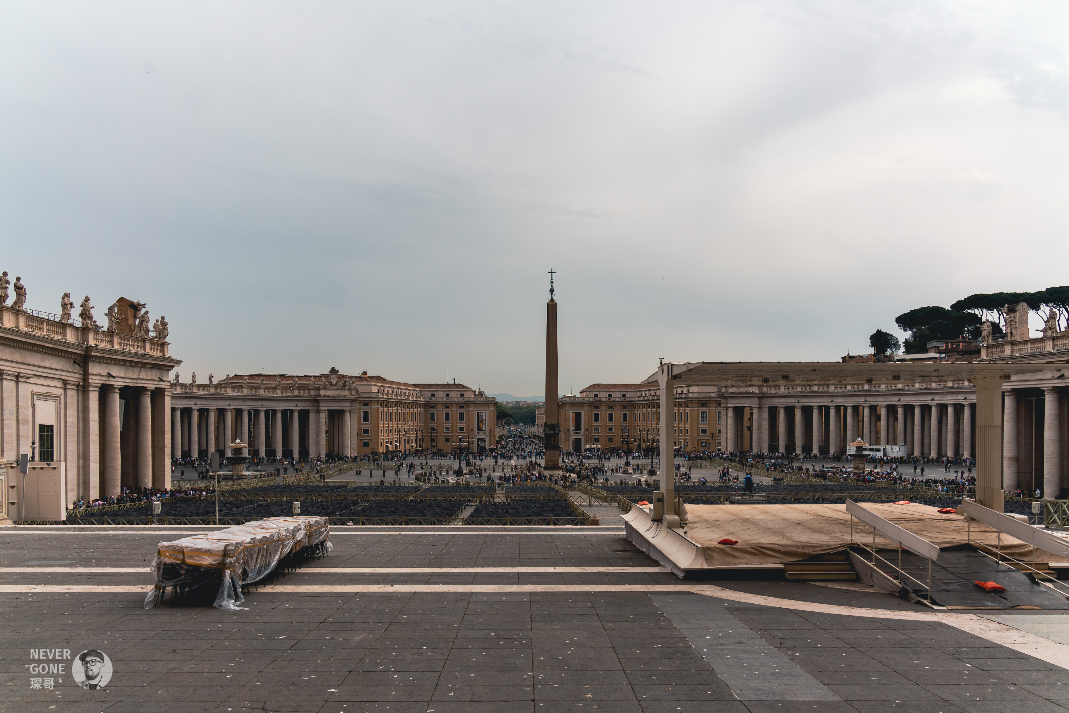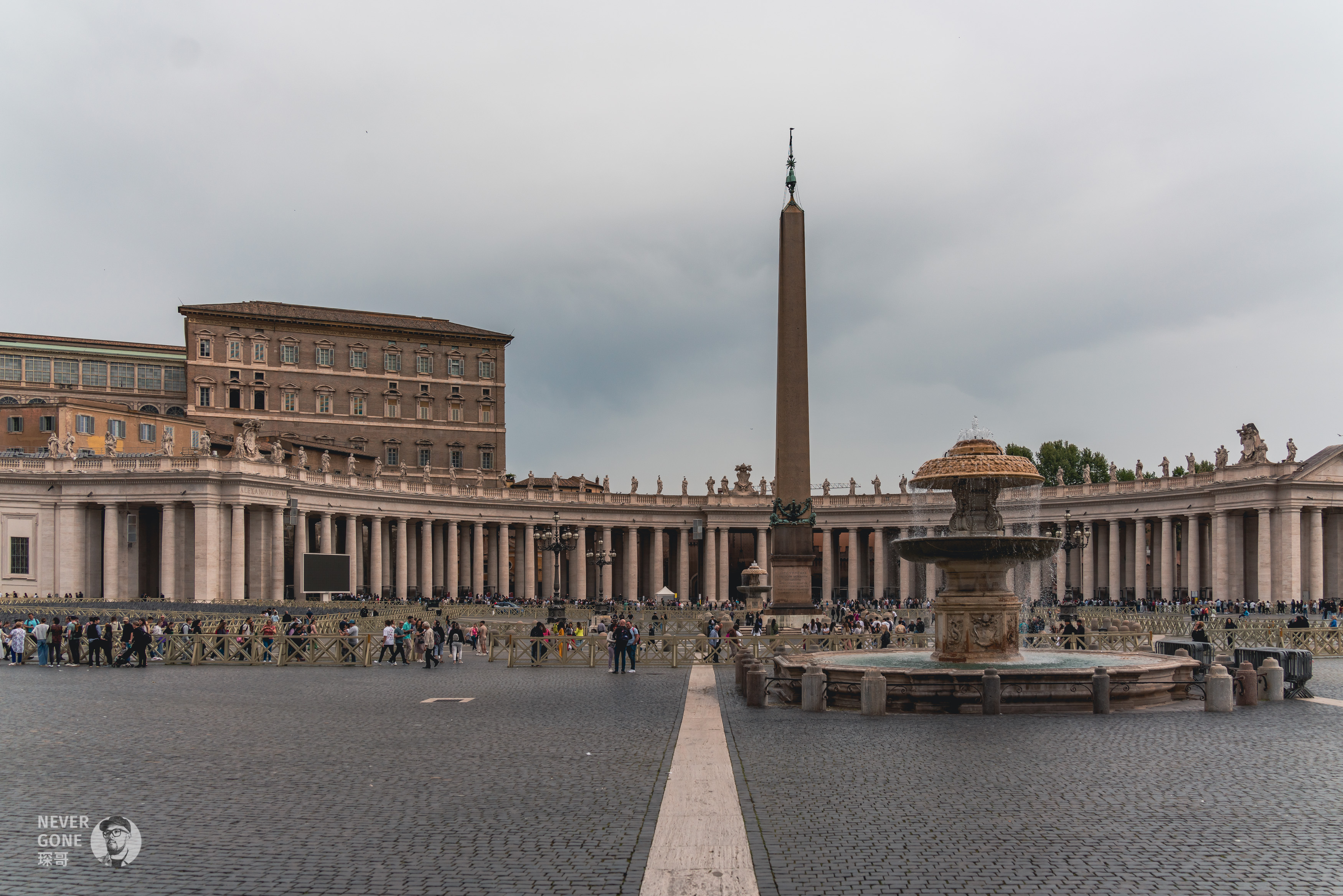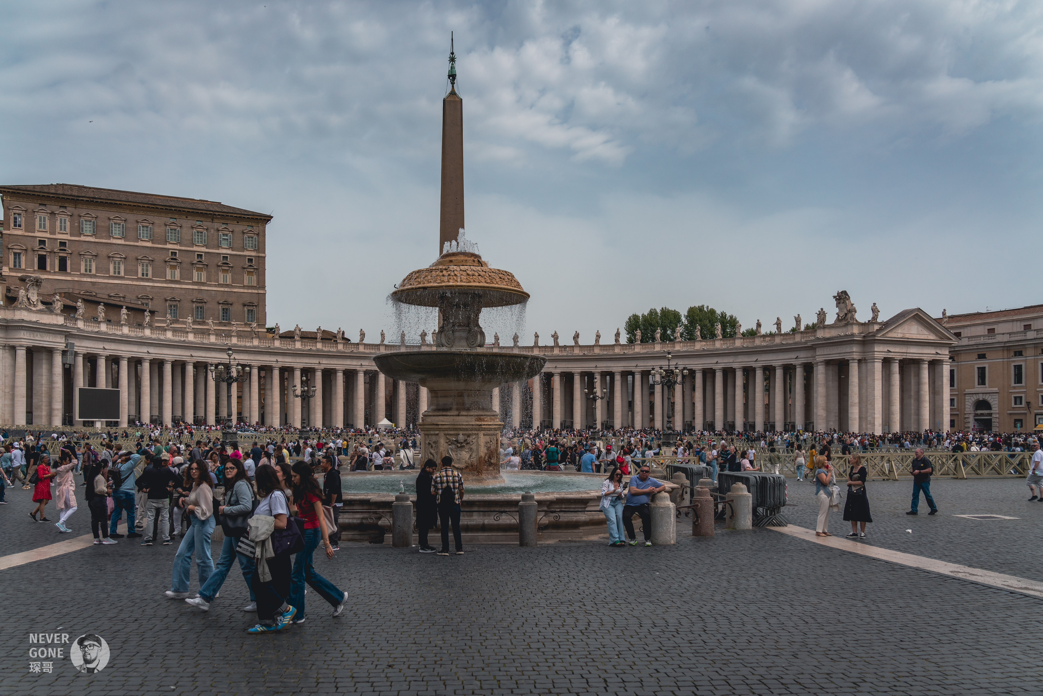 广场里面都是排队进入圣彼得大教堂的。广场由著名的巴洛克风格建筑师吉安洛伦佐·贝尼尼(Gian Lorenzo Bernini)设计,从1656年开始建设,历时11年完成。广场的建筑特色包括286根柱子排列成的梯形庭院,象征着教堂张开双臂,欢迎来自世界各地的人们。广场两侧各有一座雕刻喷泉,分别由卡洛·马德尔诺 (Carlo Maderno) 于1614年建造和贝尔尼尼于1675年建造