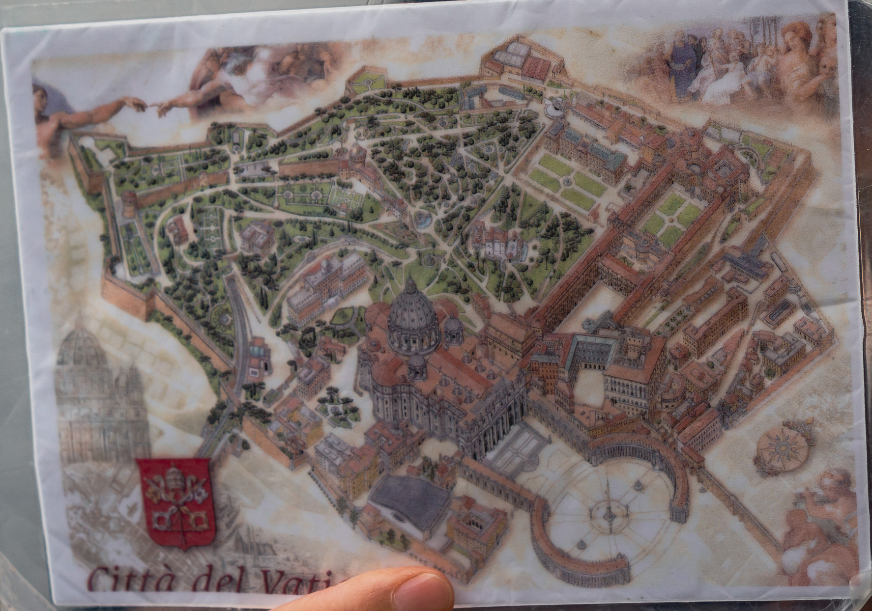 前往梵蒂冈,不到1000人的国中之国,非常小,下面是手绘的鸟瞰图,对游客开放的就是右下角钥匙形状的广场和圣彼得大教堂