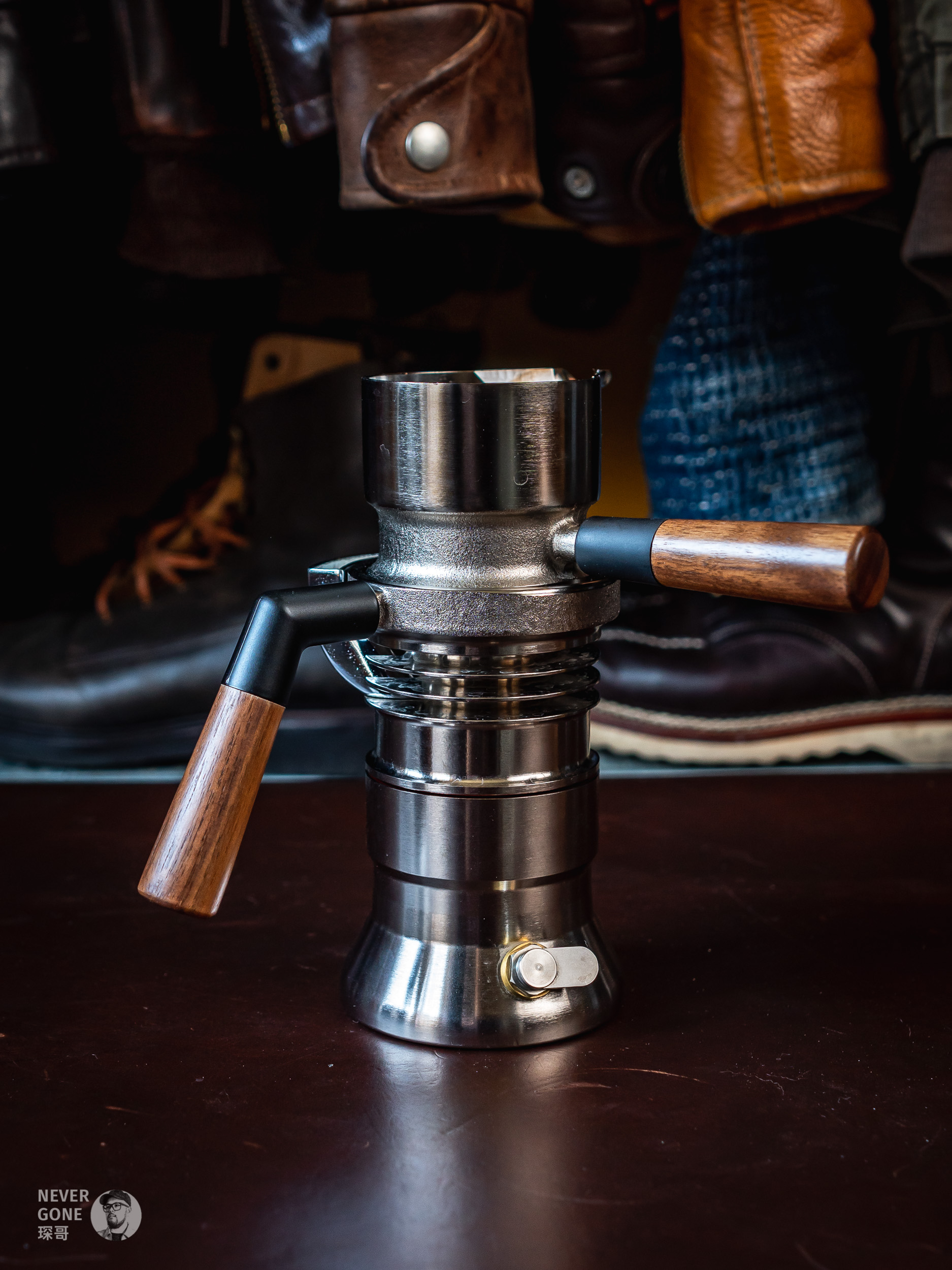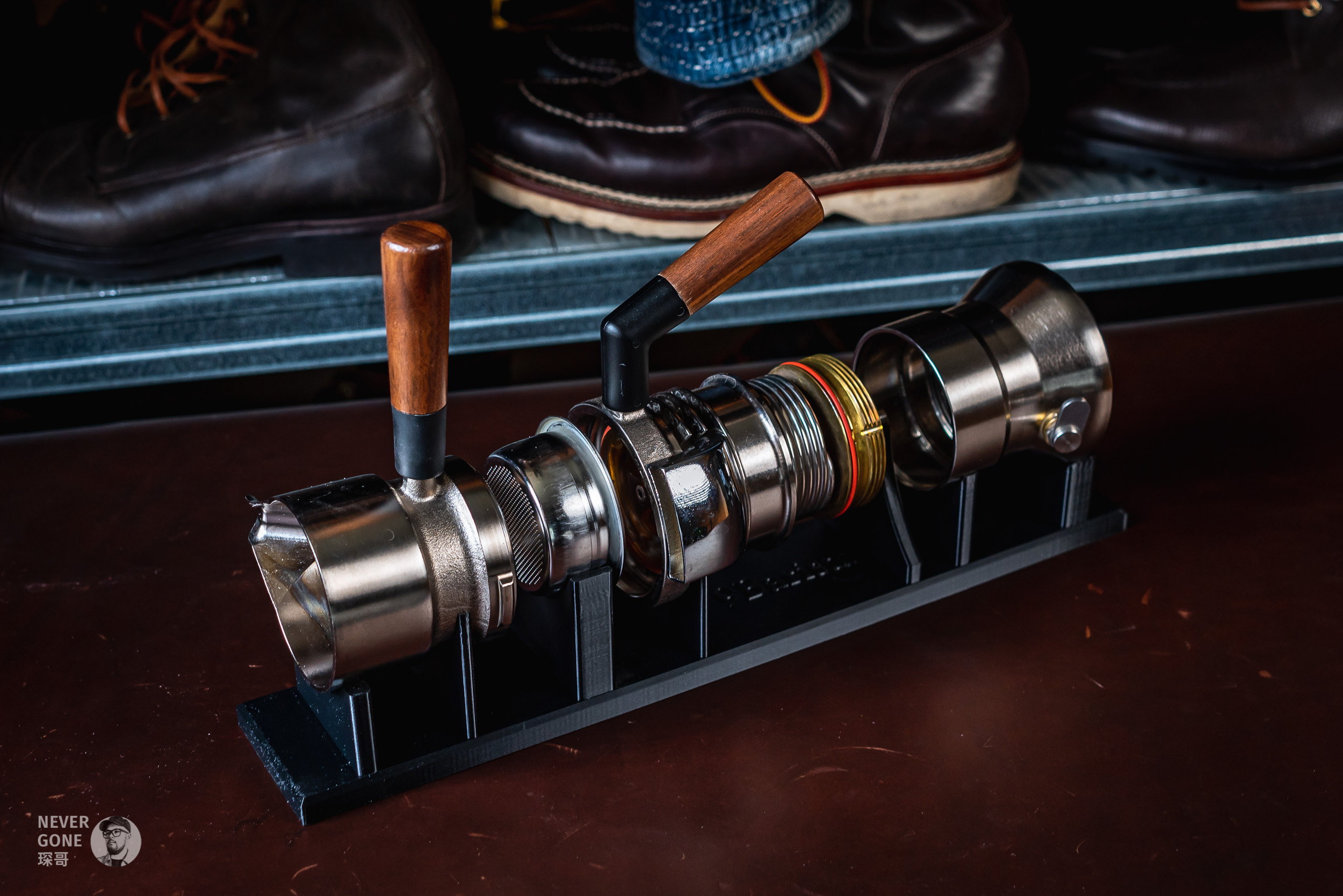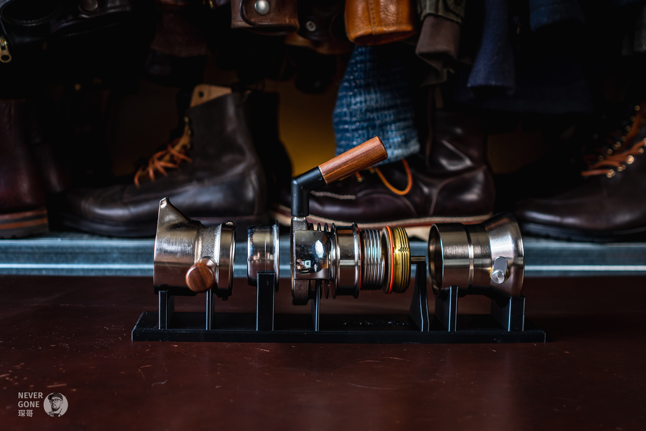 手压有看过Flair 58啥的,但也觉得占地方。气压的话觉得定期买气瓶很麻烦也排除了,最后就只剩下了9 Barista。这种蒸汽朋克风格的金属玩具,再配上那个展示架,感觉十分戳我,而且和我喜欢的皮料、意大利Metalsistem工业风货架等等都挺搭的