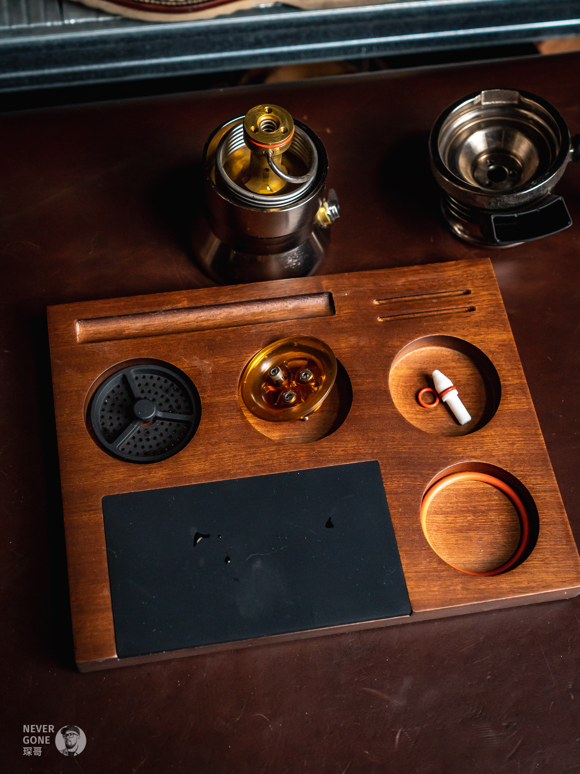 盖上分水网,再把上壶装上去,等着出液就行了,最后大概5分钟能得到1份浓缩。原装的黑色硅胶分水网看起来比较拉,我升级成金属的了。再就是原装粉碗打孔也不太行,换成IMS粉碗了。替换下来的也不是说就没用了,万一哪次要连续出2份的话,两个粉碗就能派上用场了