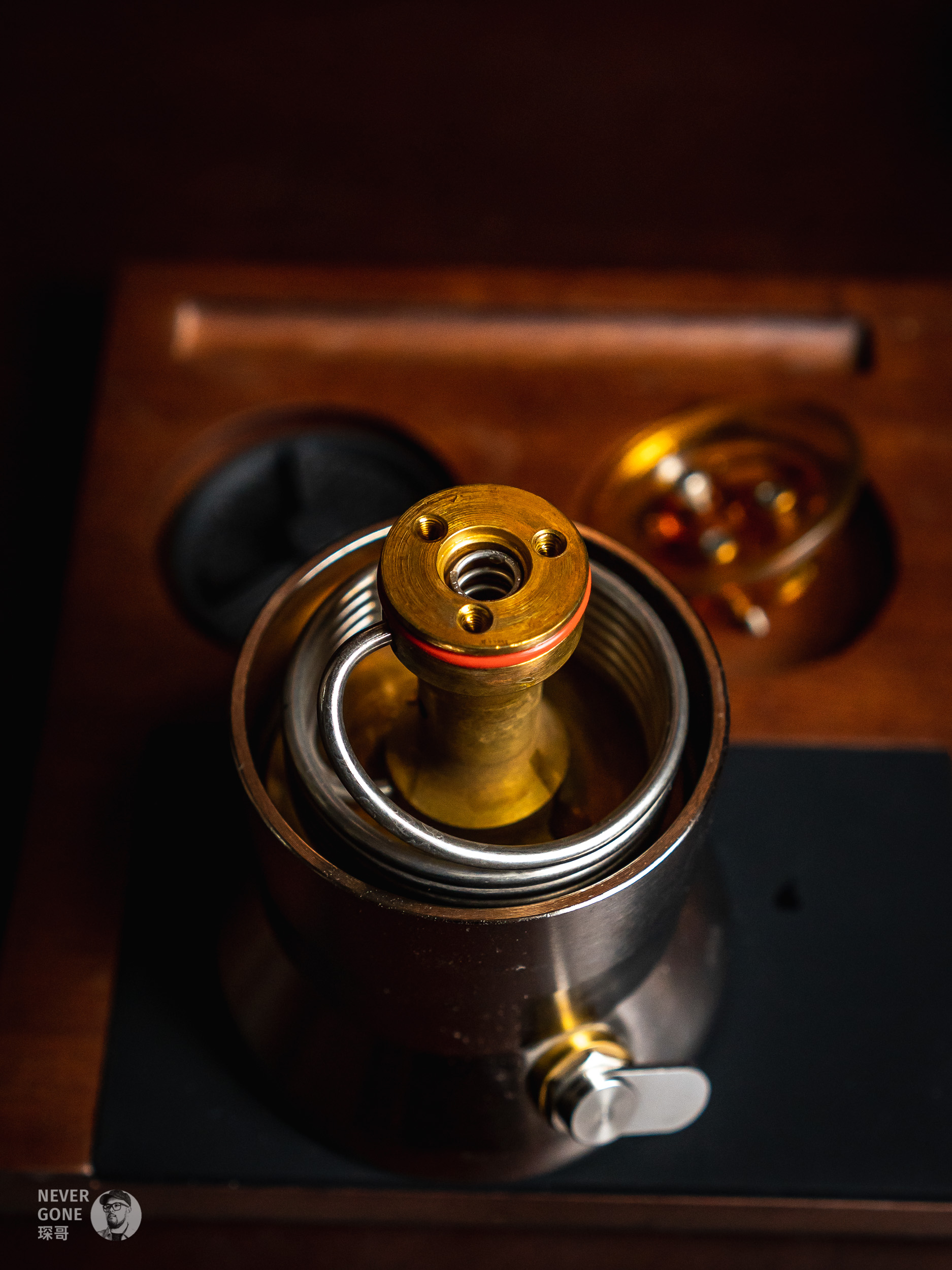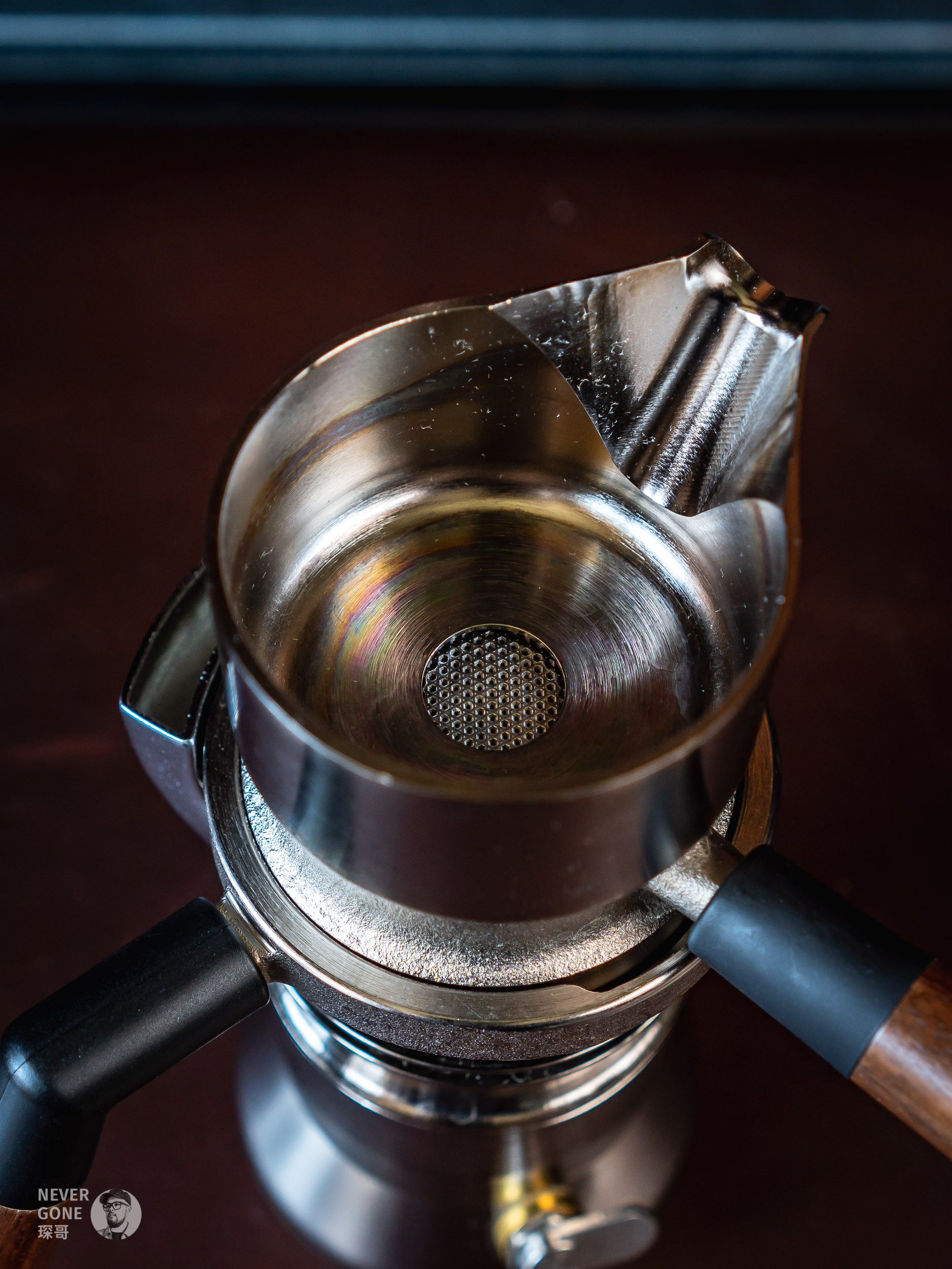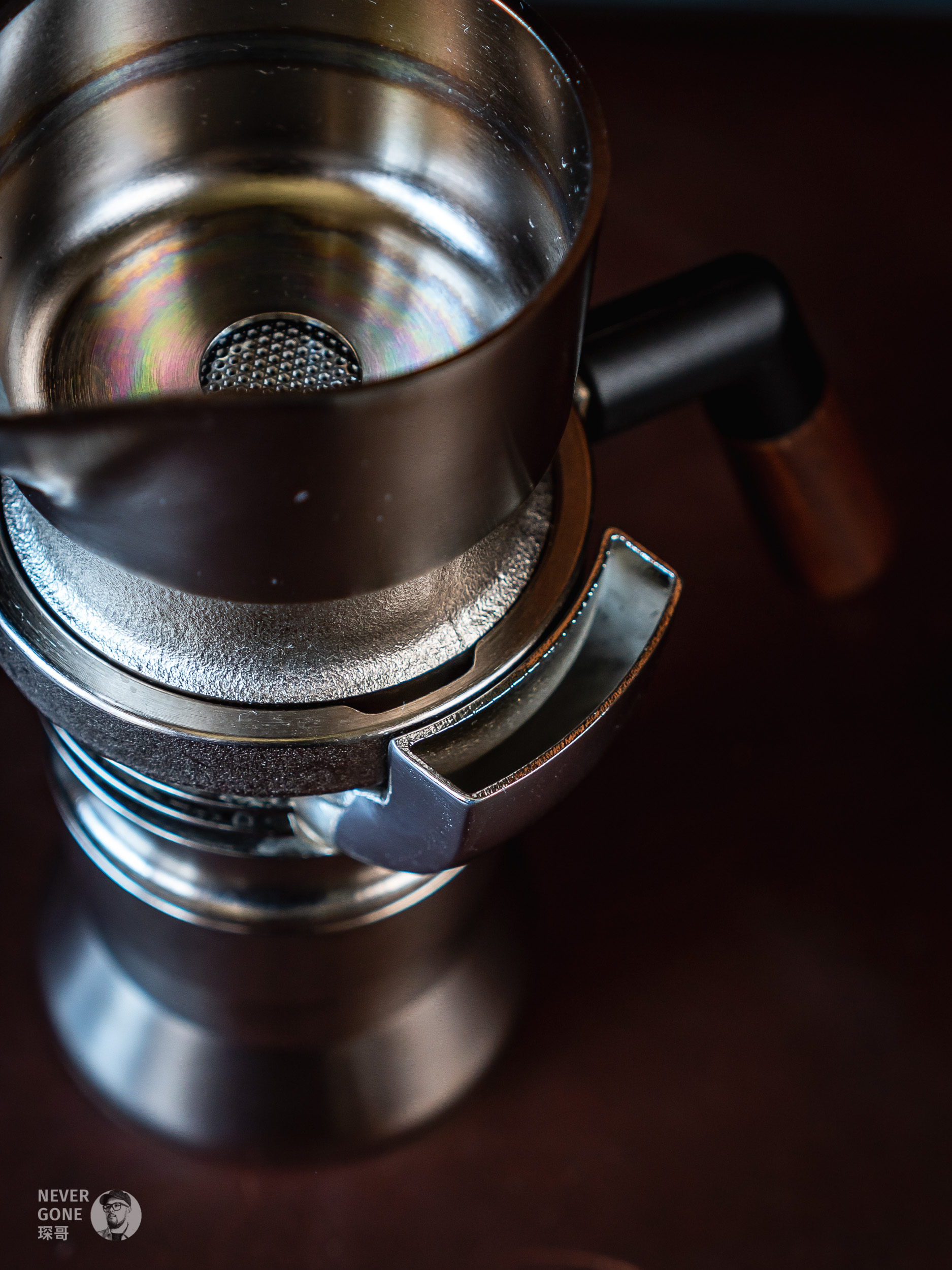 上壶是一个倒置的53mm意式手柄,使用的时候里面放入相应直径的粉碗。可以把下壶+中壶看做是一个锅炉,锅炉产生的高温高压水流通过这个倒置的手柄,最终就出来了浓缩